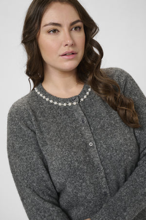 Peysan er virkilega vönduð og þétt prjónuð með skraut perlum í hálsmáli.