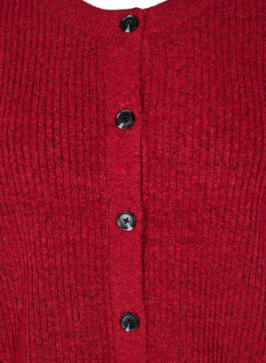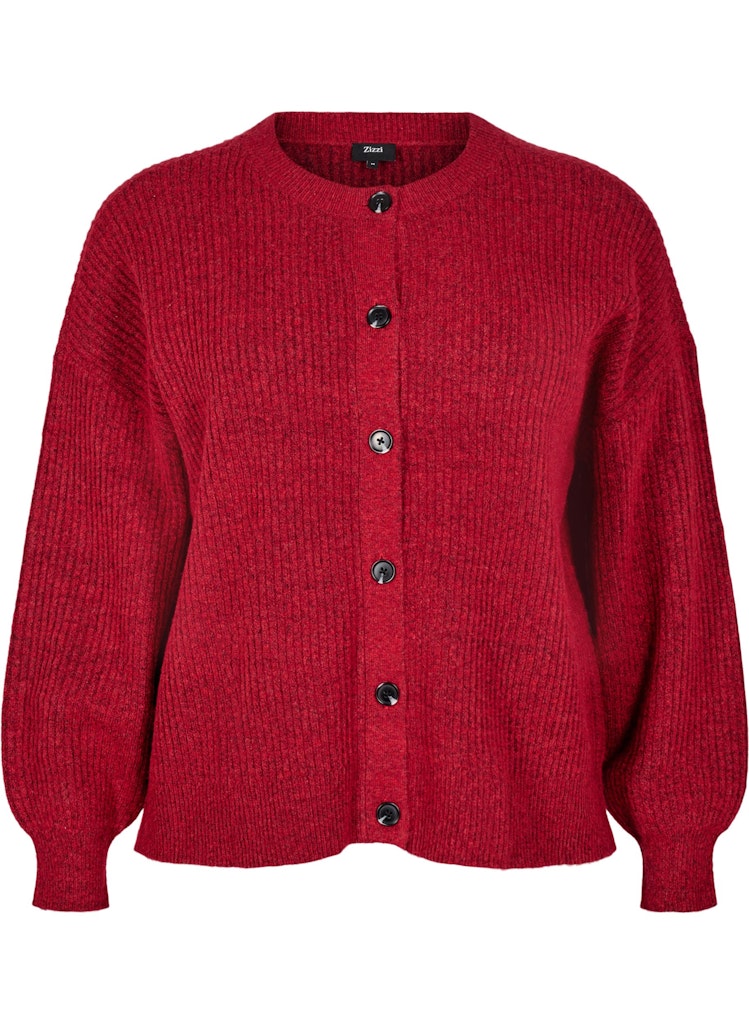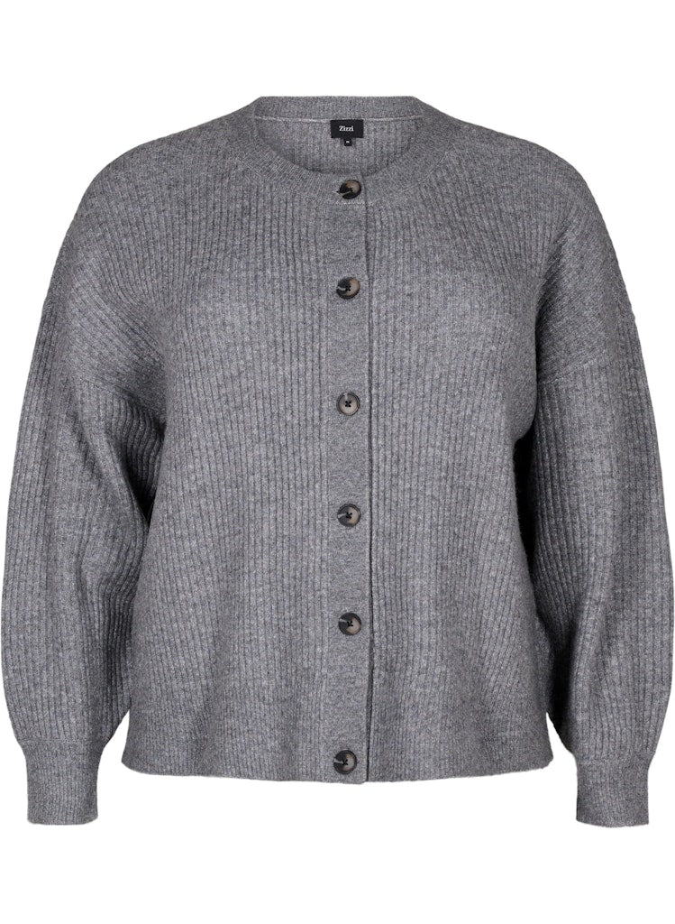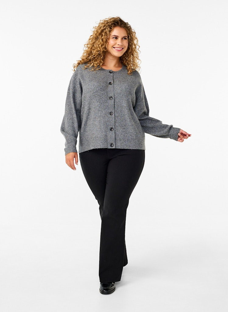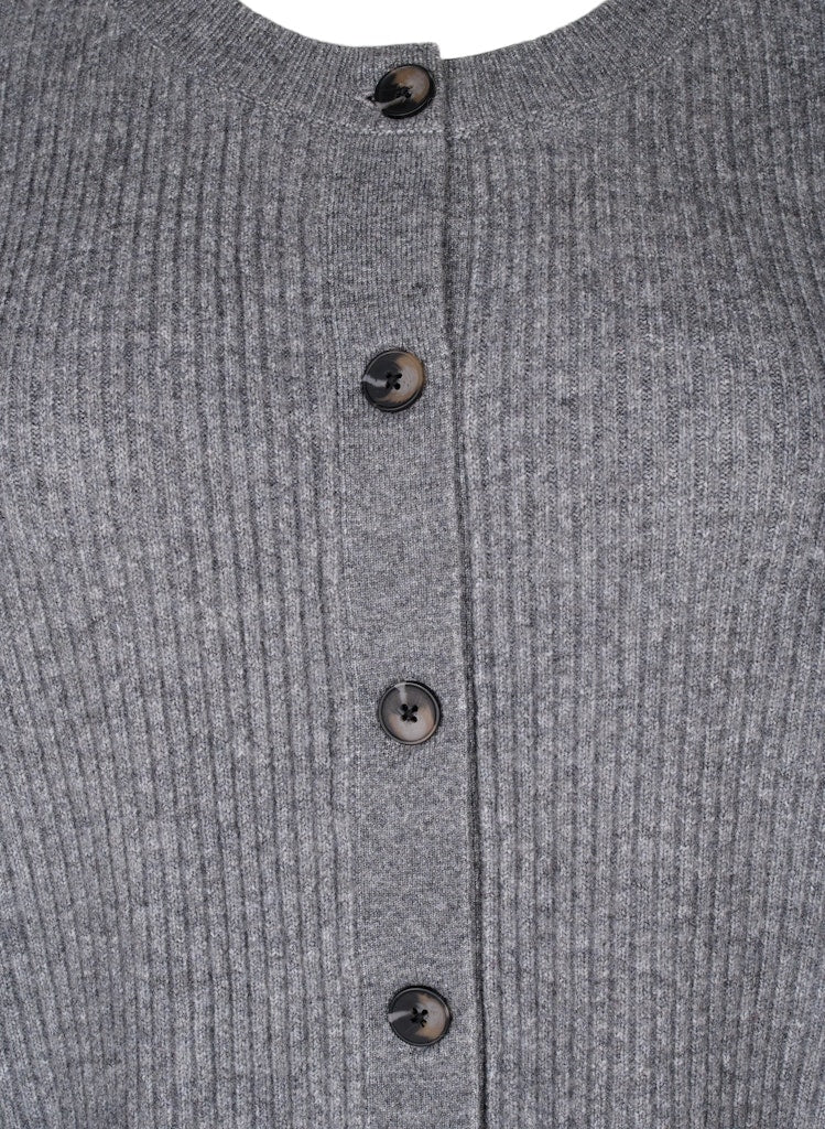 Peysan er með lausu sniði, rúnnuðu hálsmáli og hneppt alla leið niður með tölum.