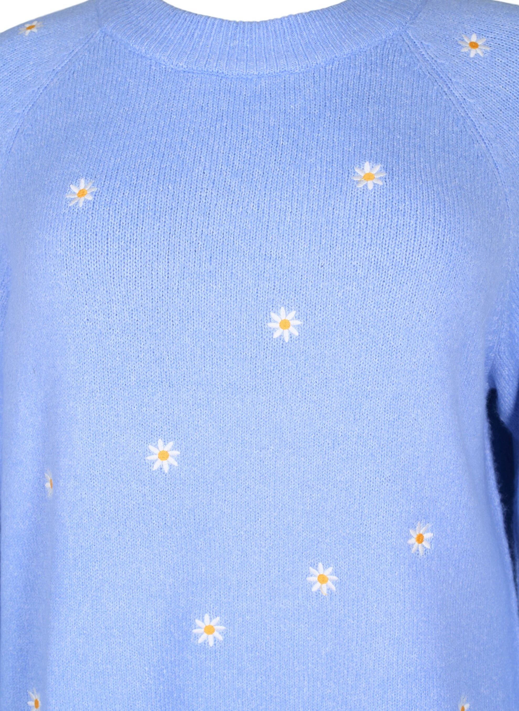 Ljósblá í grunninn með litlum hvítum útsaumuðum blómum.