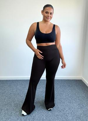 Súper mjúkar og þægilegar svartar bootcut buxur með breiðum mjúkum streng að ofan.