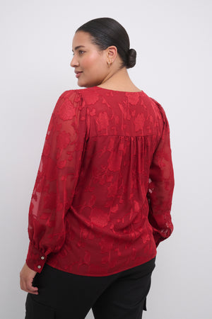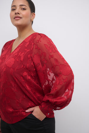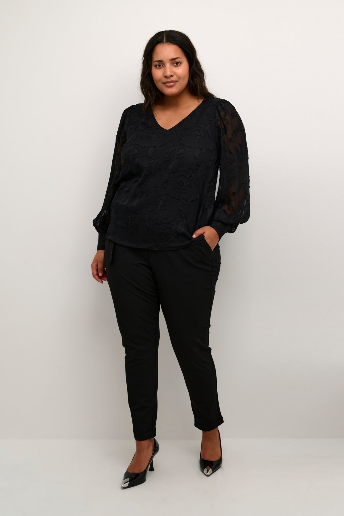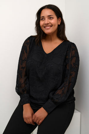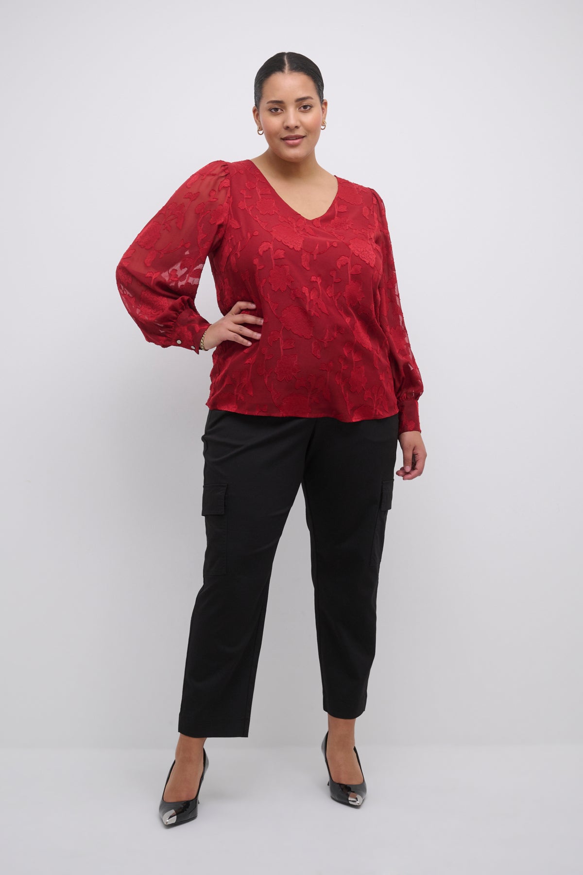 Laust snið, V-hálsmál og lausar ermar með rykkingu og teygju neðst niðri.