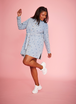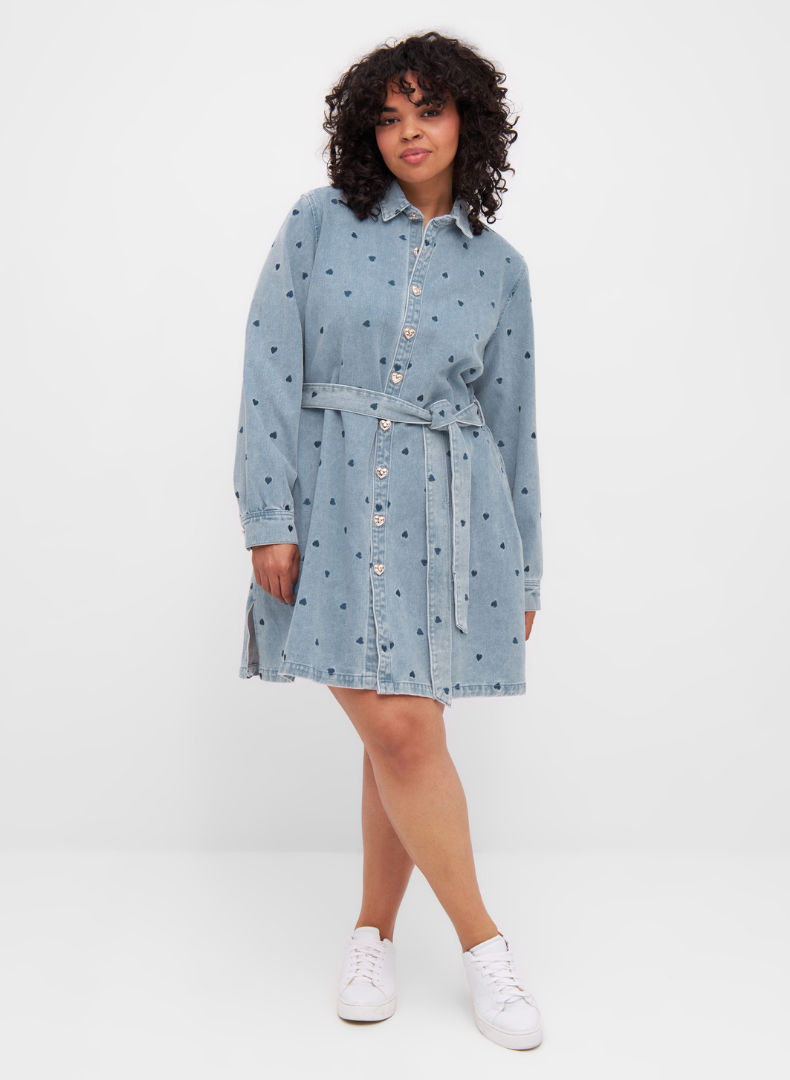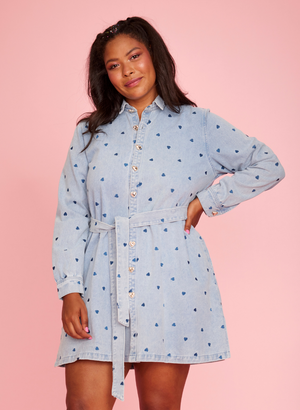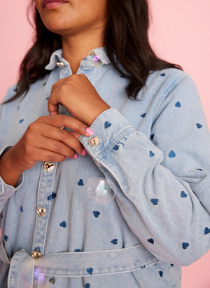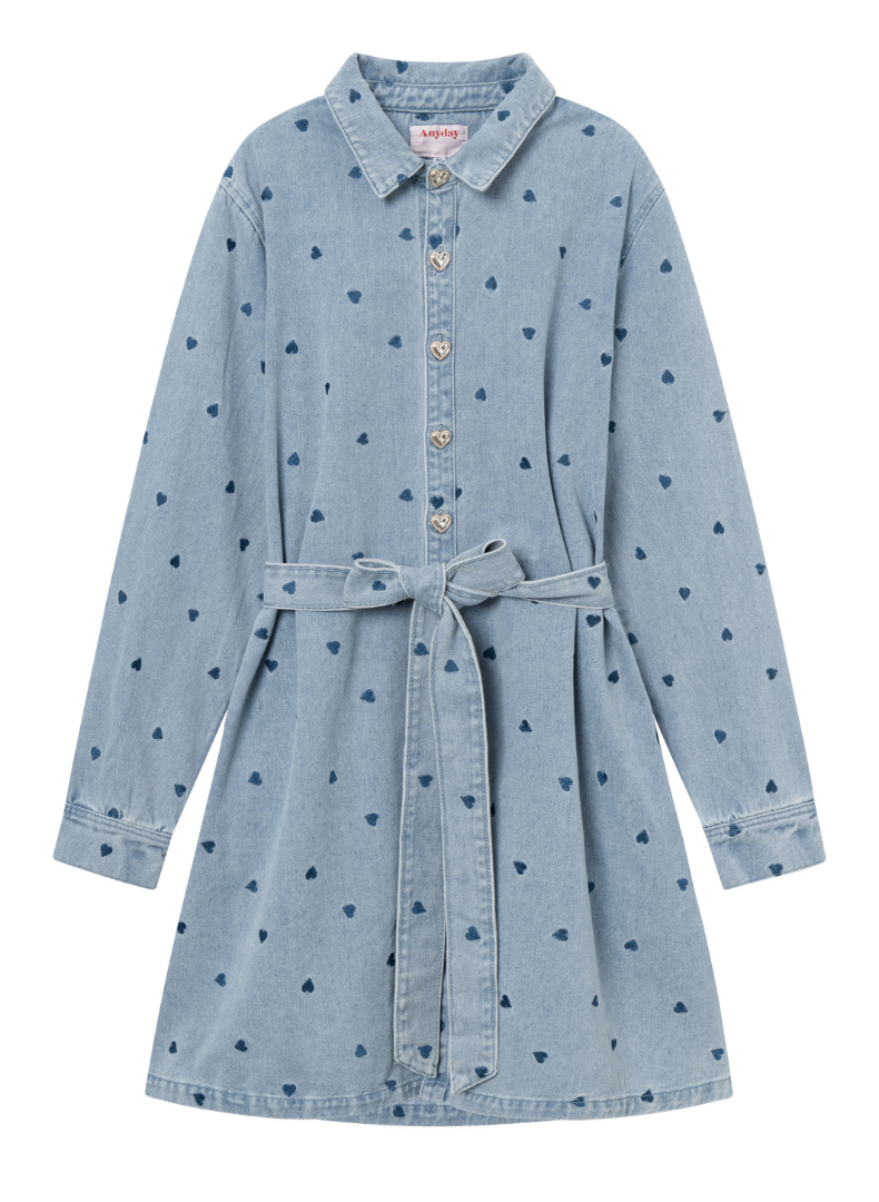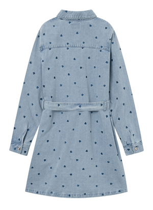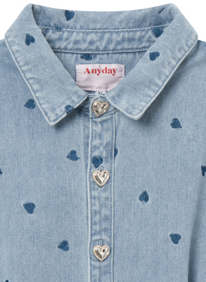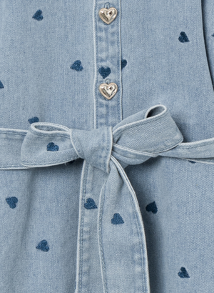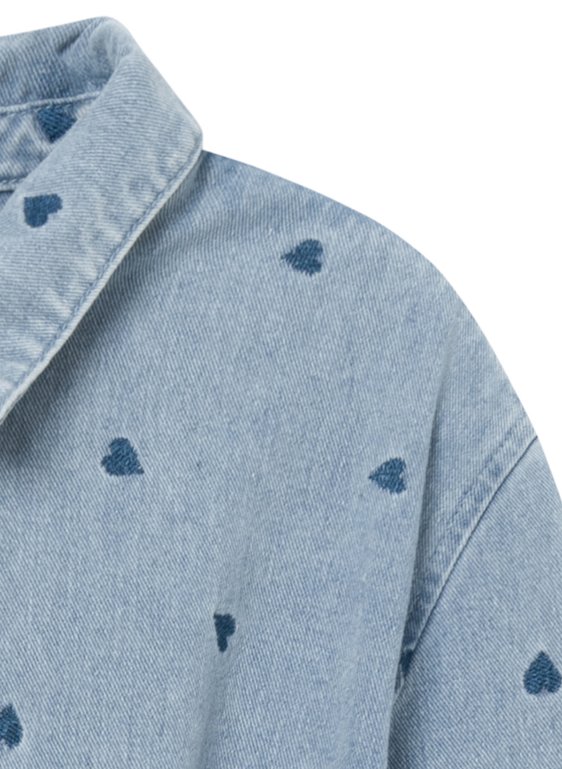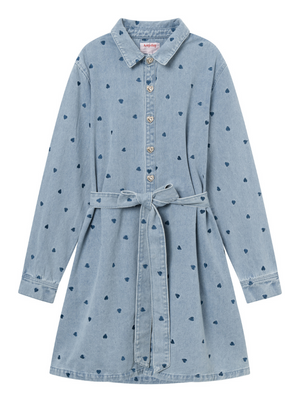 Flottur skyrtukjóll úr gallaefni með bróderuðum dökkbláum hjörtum,kjóllinn er hnepptur alla leið niður með hjartalaga tölum - ótrúlega sætt!