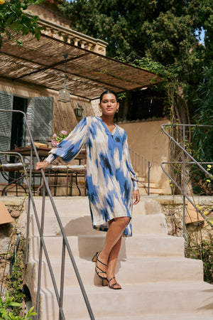 Kjóllinn er með V-hálsmáli, aðeins lausu sniði og langar ermar með stroffi neðst.