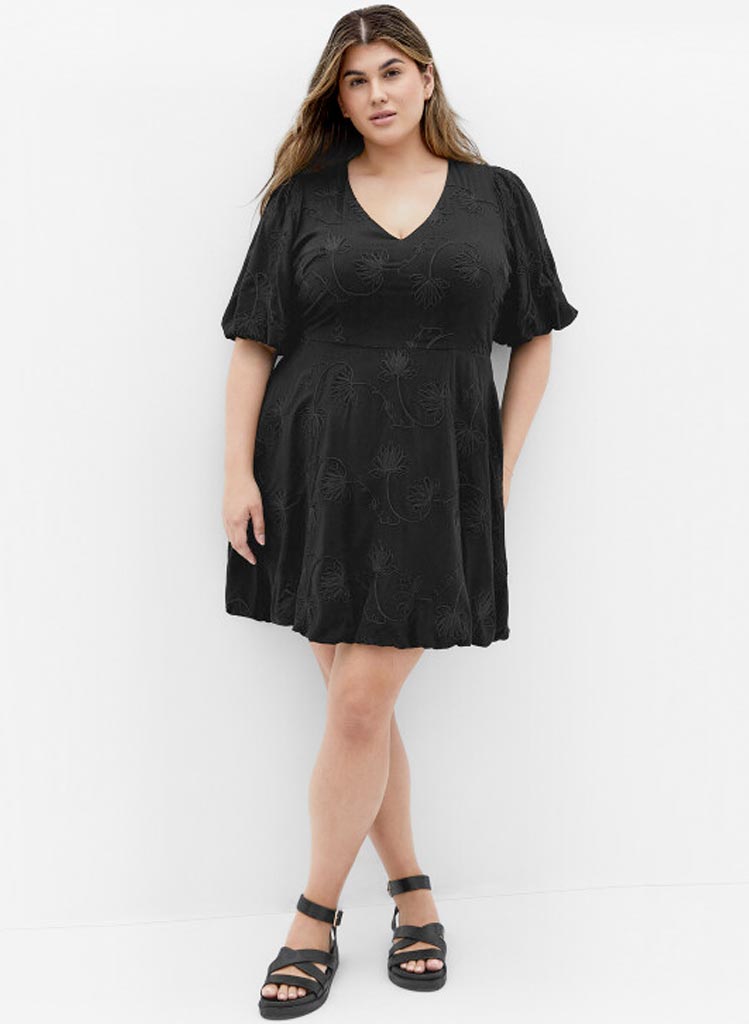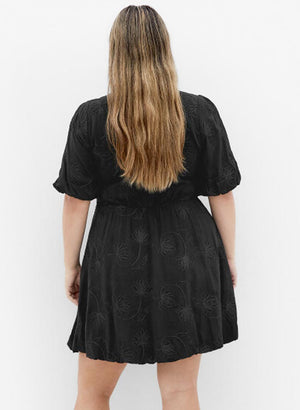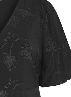 Fallegur og klassískur svartur kjóll með útsaumuðu svörtu mynstri.