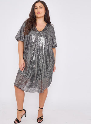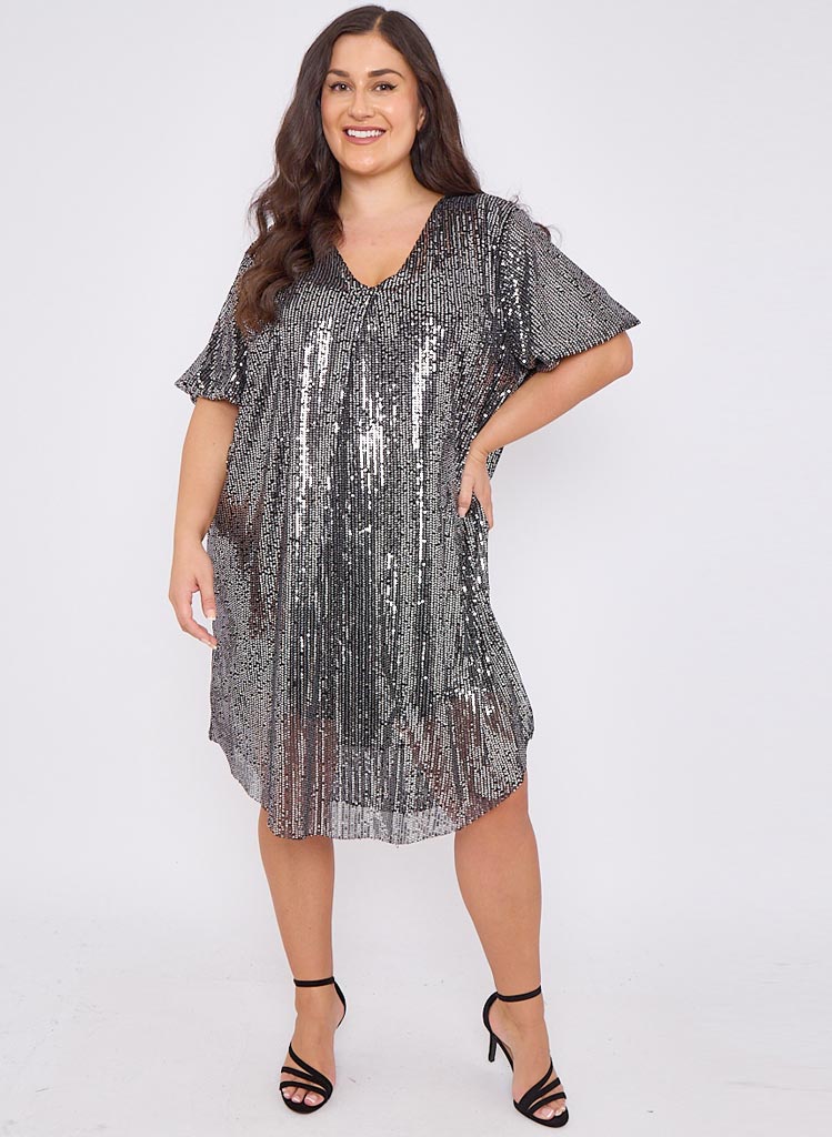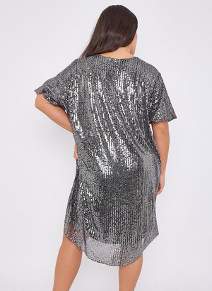 Fallegur glamúr pallíettukjóll með lausum stuttum ermum sem ná sirka að olboga.