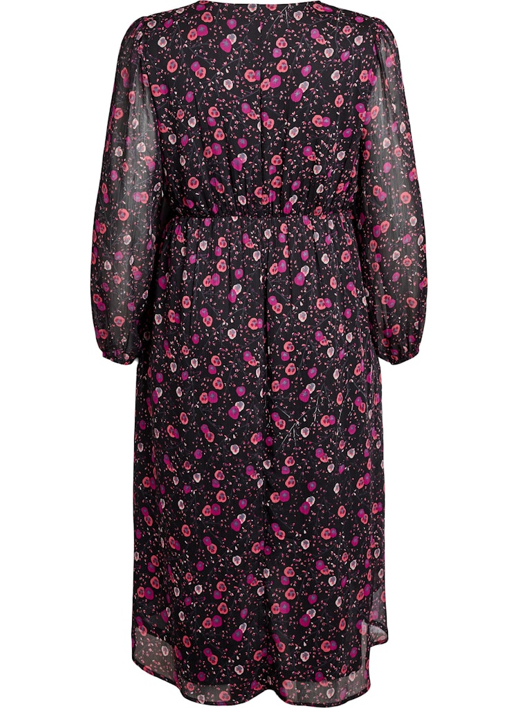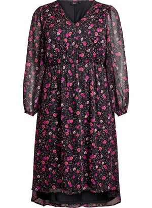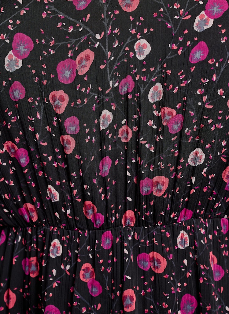 Efnið er svart í grunninn og falleg bleiktóna blóm eru á kjólnum
