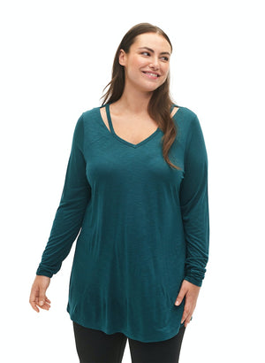 V-hálsmál og 'cut out' framan við hálsmálið.