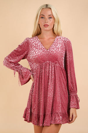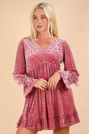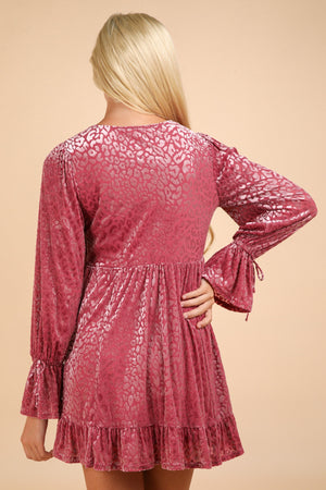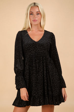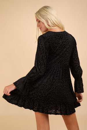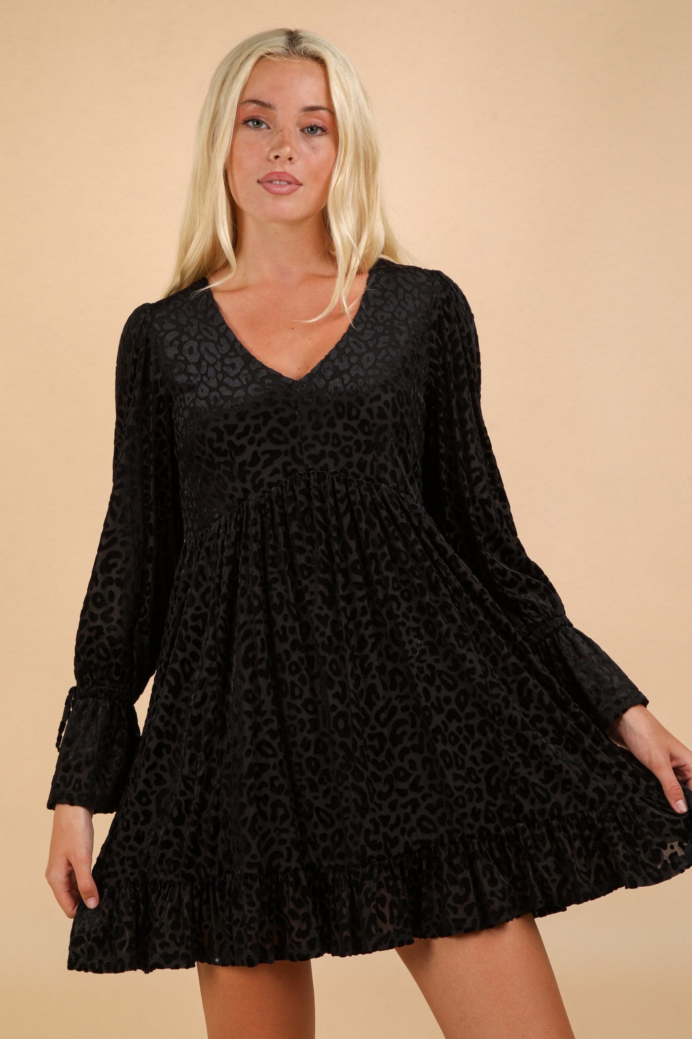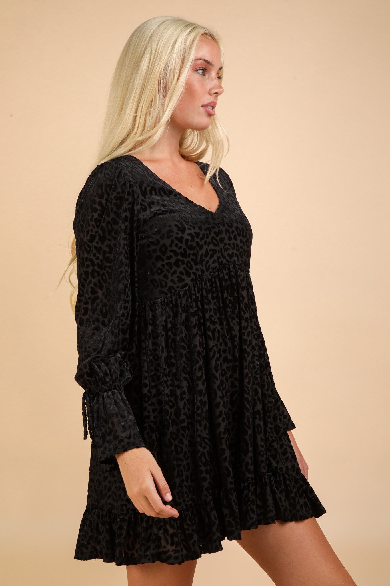 Fallegur A-snið skjóll með síðum ermum og skemmtilegu hlébarða munstri í velúr áferð.