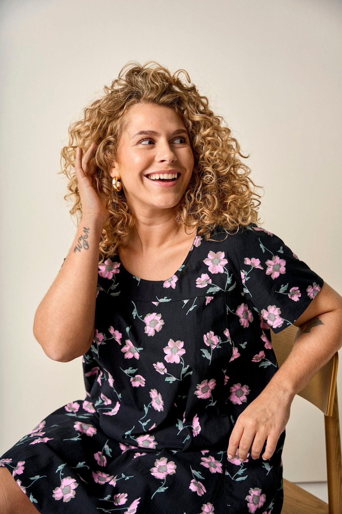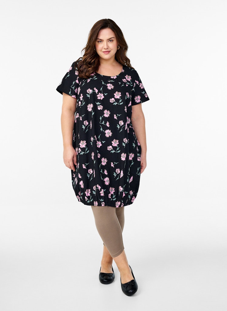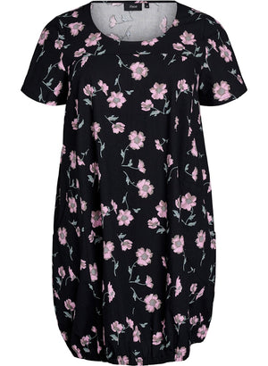 Bómullarkjóll með stuttum ermum, laus teygja neðst niðri og vasar að framan.