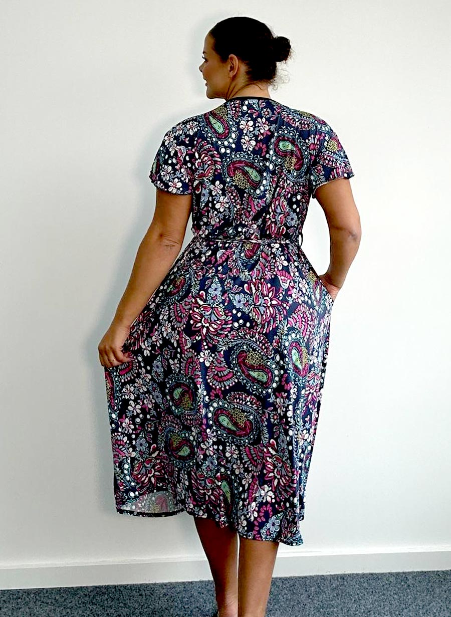 Wrap hálsmál, teygja í mittinu og mjög góð teygja í efninu.