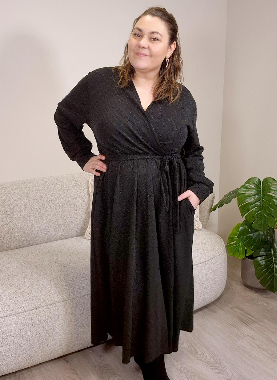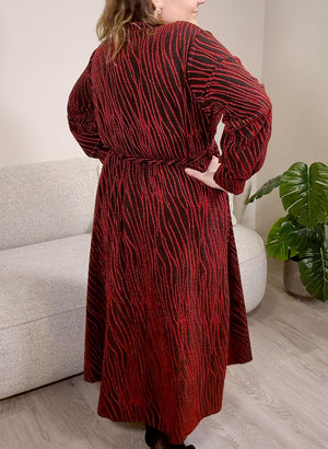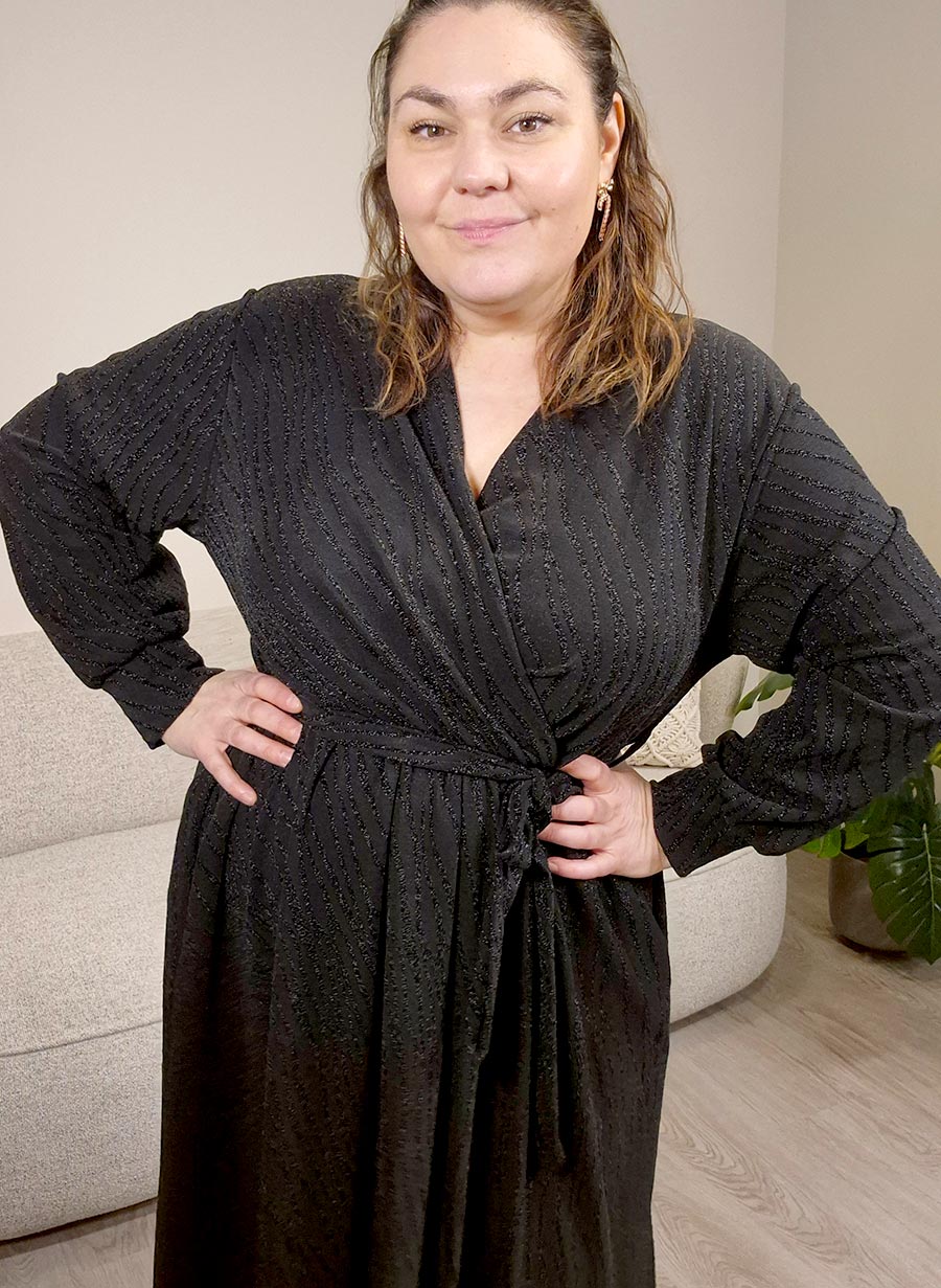 Kjóllinn er svartur í grunninn með mynstruðu glitrandi lúrex þráðum sem gerir hann extra sparilegan.