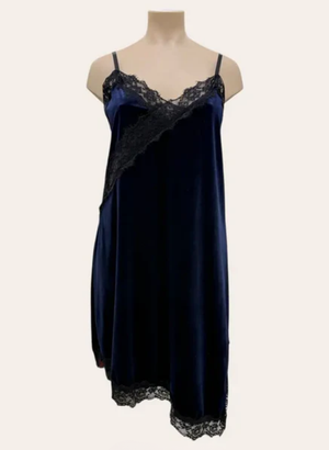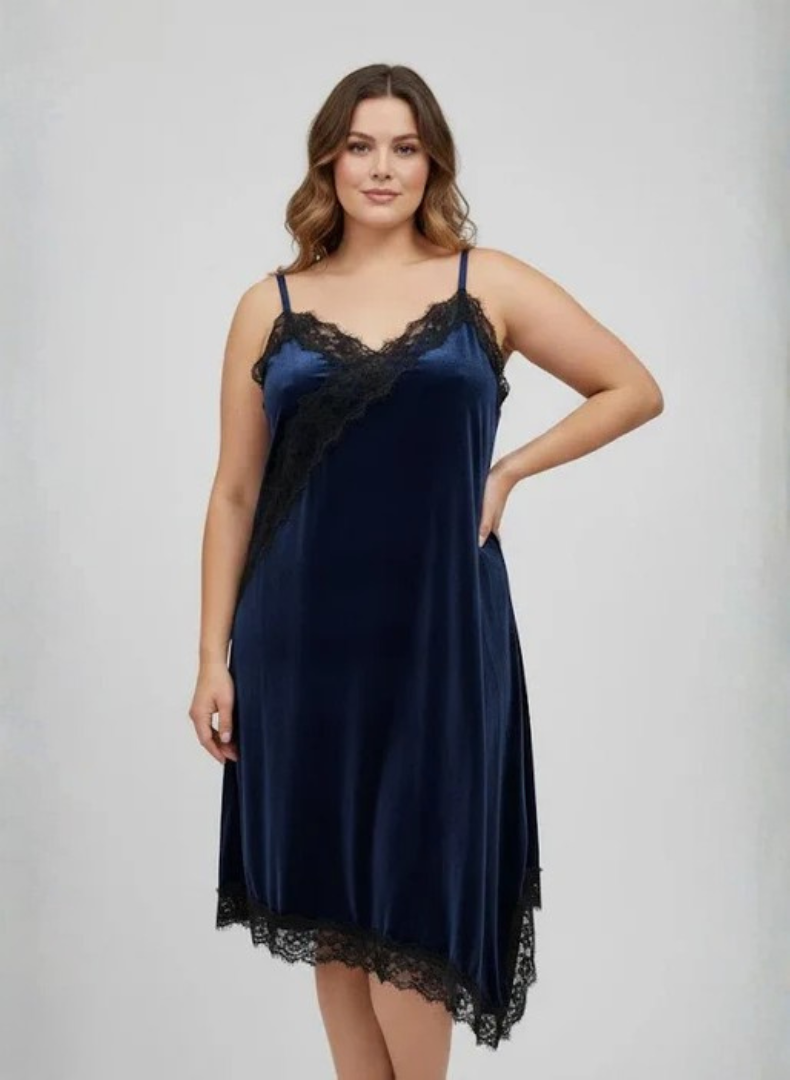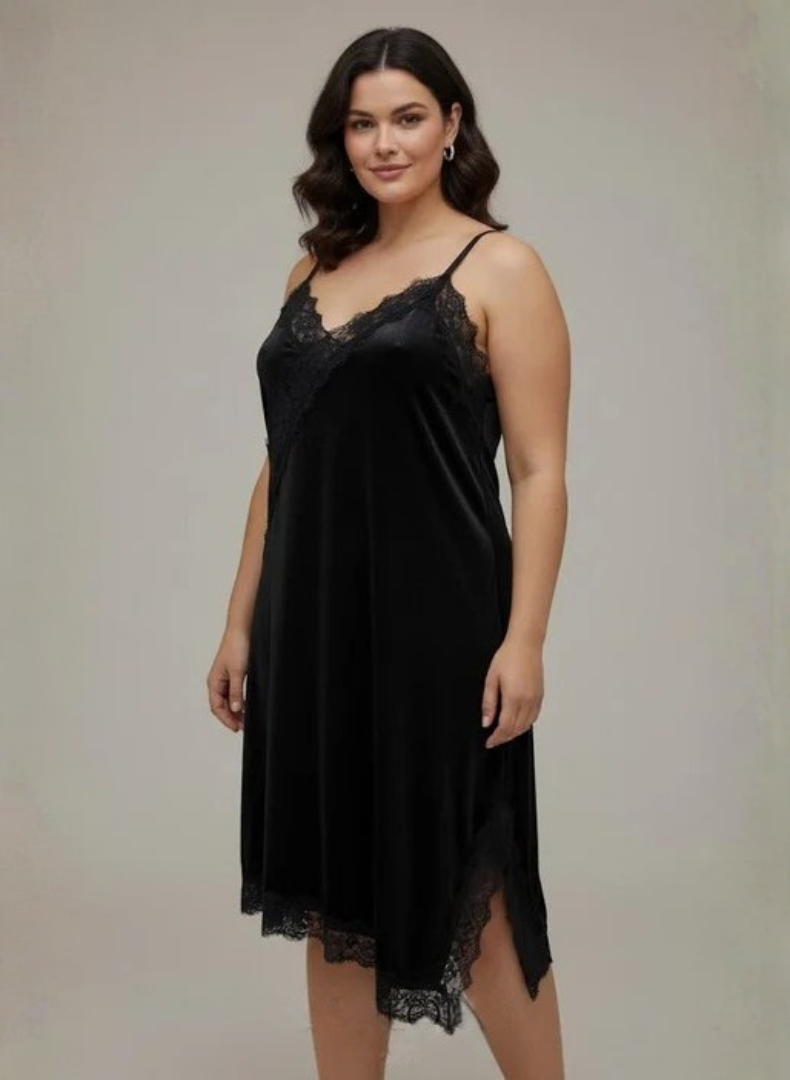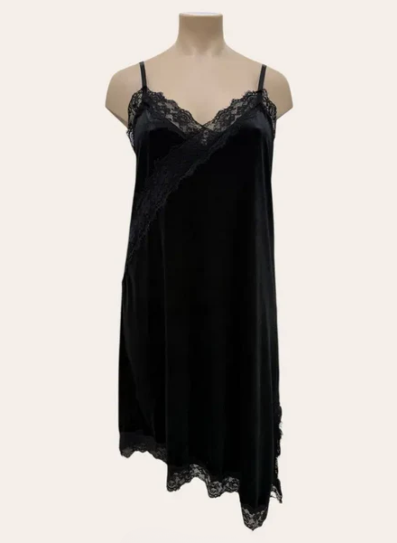 Kjóllinn er með grönnum stillanlegum hlýrum ásamt blúndu í hálsmáli og skálaga búndu neðst á toppnum.