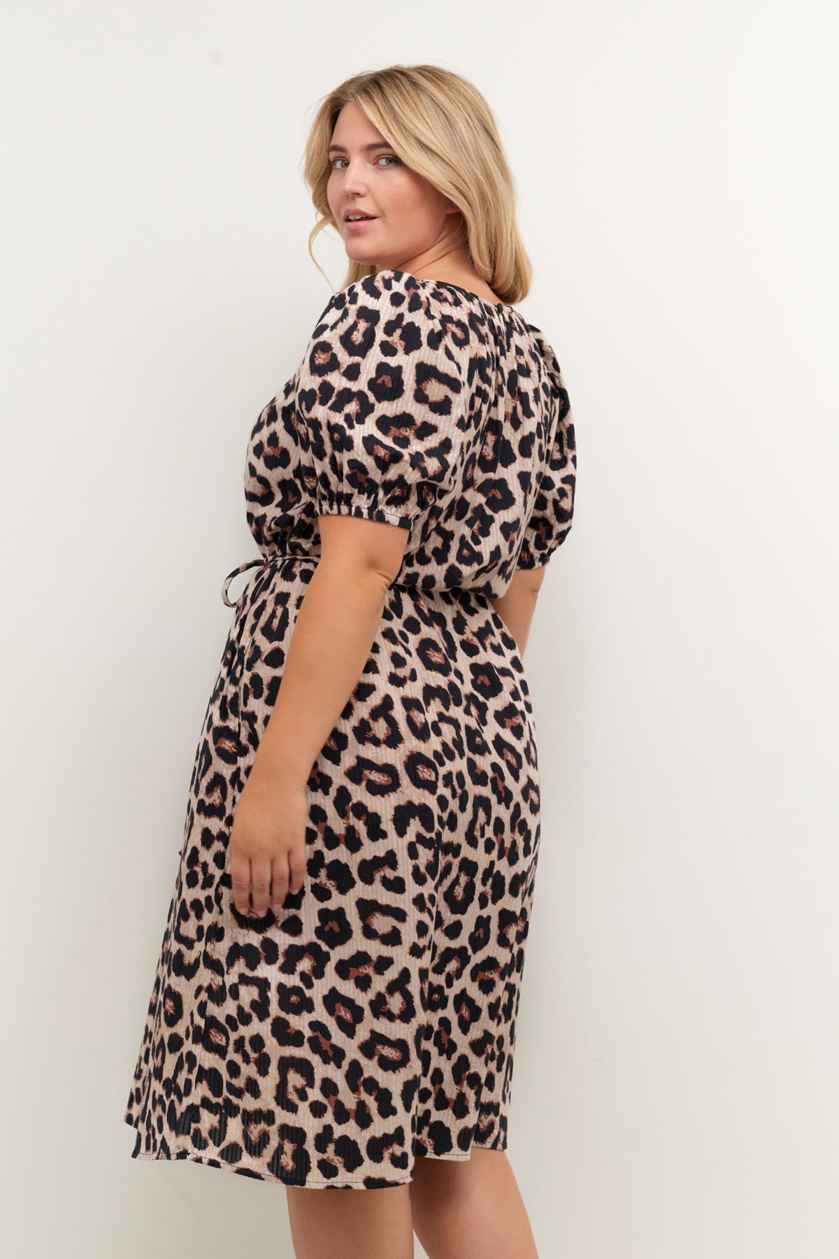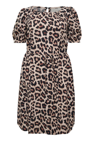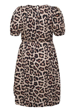 Efnið er með fínlegri hálfgegnsærri röndóttri áferð og er drapplitað í grunninn með stóru hlébarðamynstri.