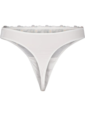 Fallega hvítar g-strengs nærbuxur með litlum hvítum blómum í stíl við Marguerite brjóstahaldarann frá Devoted - undirfatalínu ZIZZI.