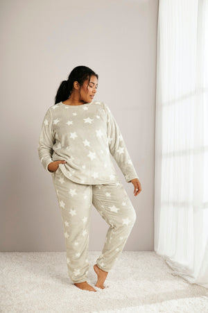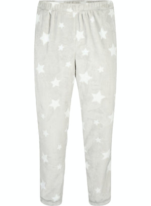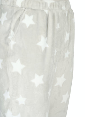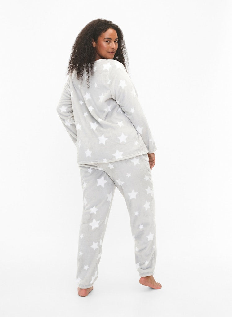 Efnið er með mjúkri loðáferð, ljósgráar á lit og hvítar stjörnur.