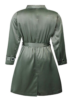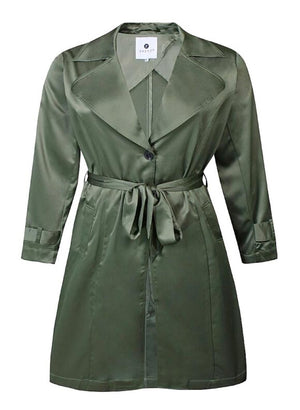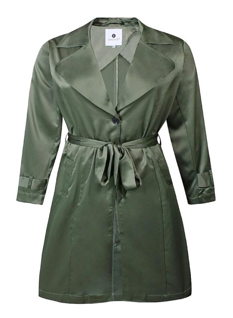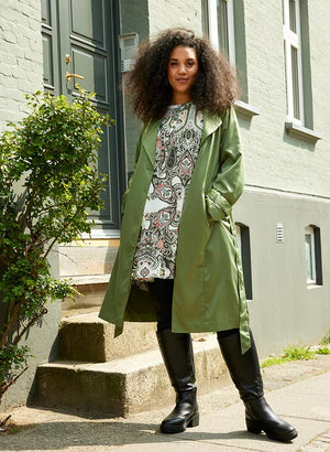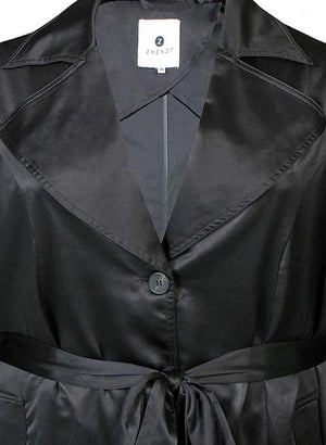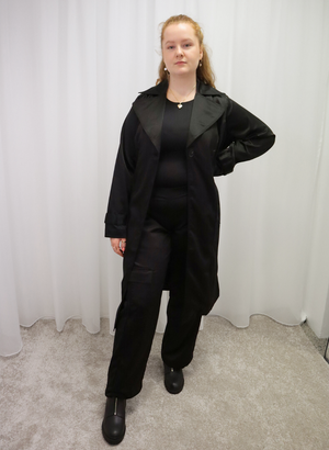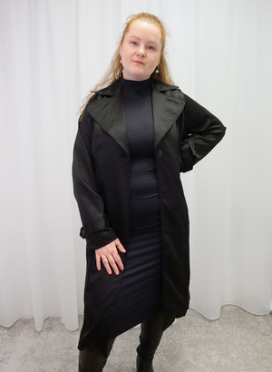Jakkinn er ófóðraður með klassísku frakka sniði, hnepptur að framan og með beltisborða.