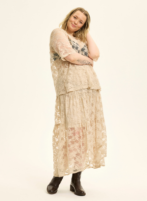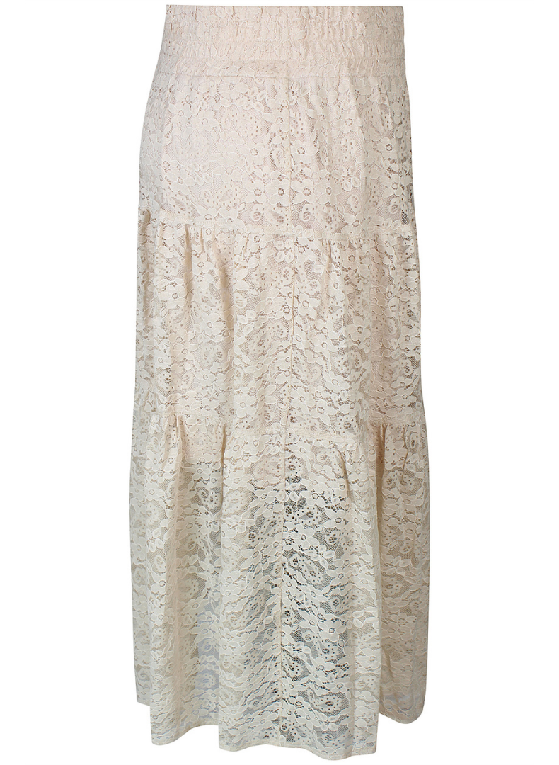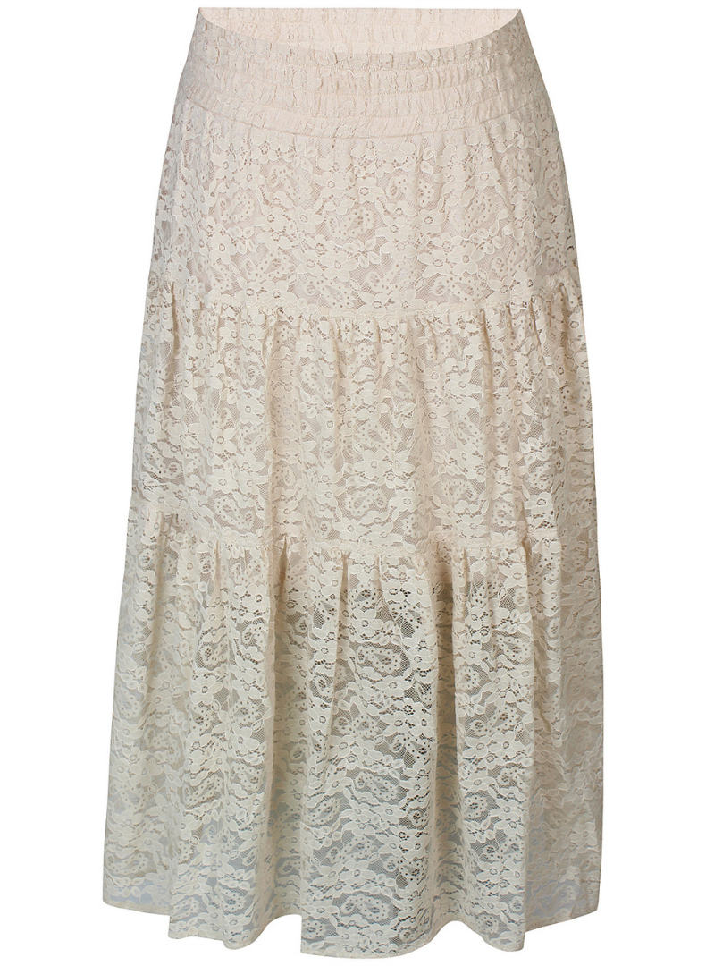 Falleg antik hvít blúnda, styttra undirpils í sman tón og svo teygja í mittinu.