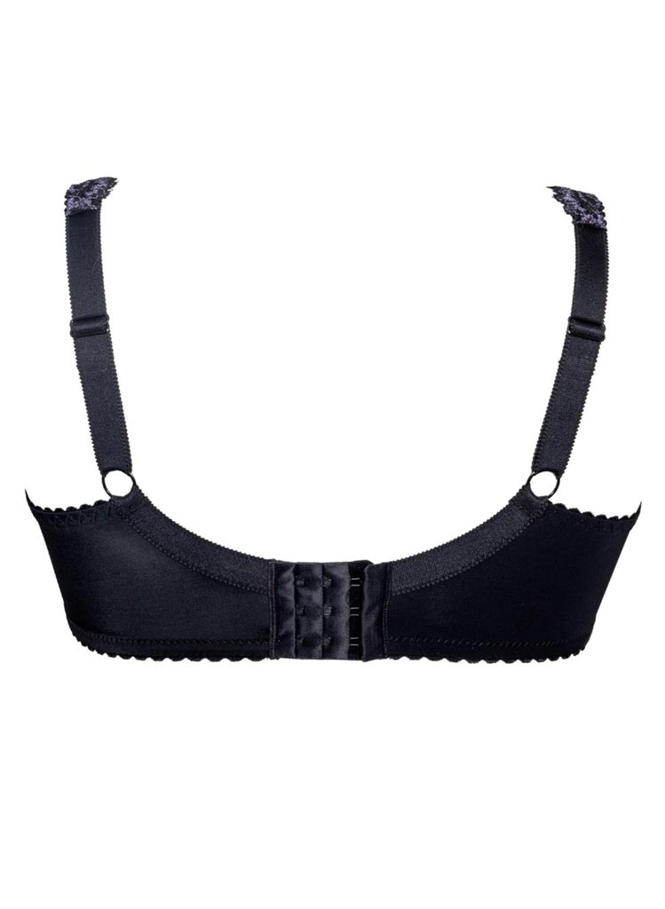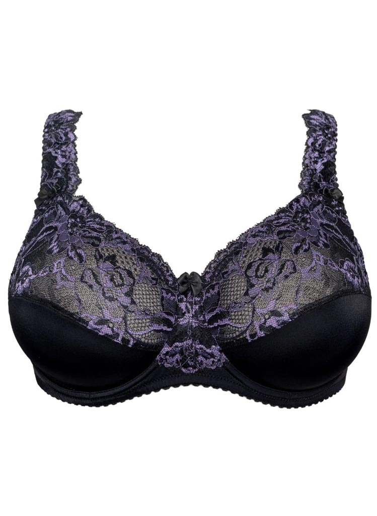 Efnið er í svart í grunninn með fallega fjólublárri blúndu.