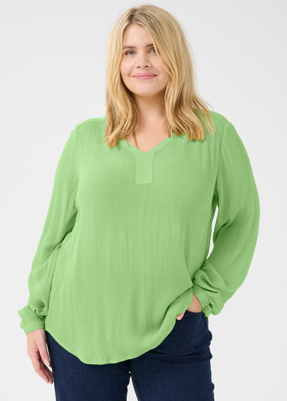 Blússan er í lausu sniði, V-hálsmál og langar ermar.