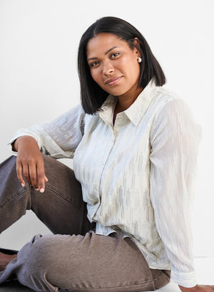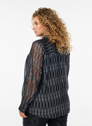 Skyrtan er hálf gegnsæ með mynstri og því tilvalið að vera í hlýrabol innanundir.