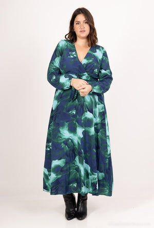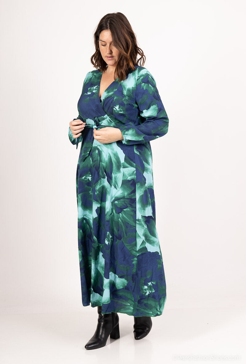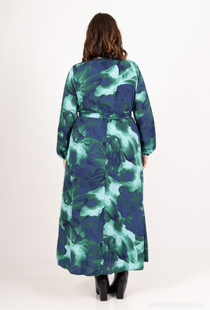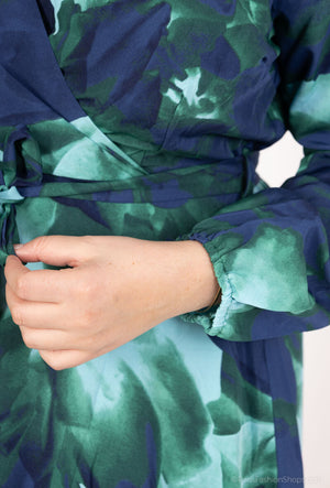 V-laga hálsmál, síðar ermar og tekinn saman í mittinu með teygju og beltisborði fylgir með.