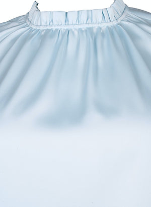 Hátt hálsmál með fínlegum pífum, tala aftan á hálsmálinu.