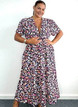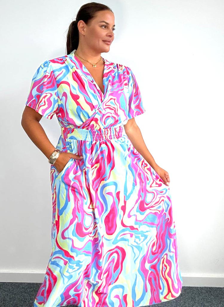 Sumarlegur síður kjóll með V-wrap hálsmáli, létt teygja í mittinu og  vasar sitthvoru megin á pilsinu.