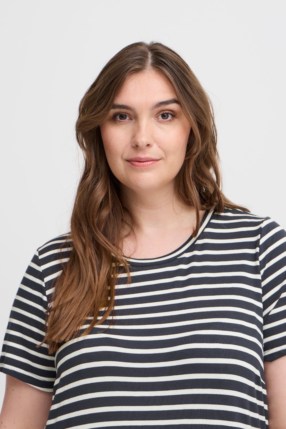 Laust snið, rúnnað hálsmál og stuttar ermar.