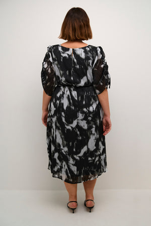Laust og frjálslegt snið er á kjólnum en honum fylgir líka beltisborði sem þú getur notað til að taka kjólinn saman inn í mittið.