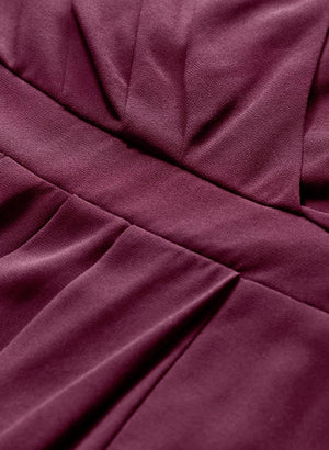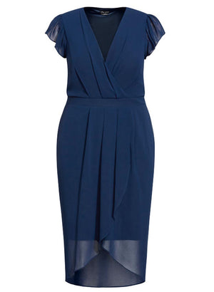 V-hálsmál með lokuðu wrap sniði og beltisborði í mittinu.