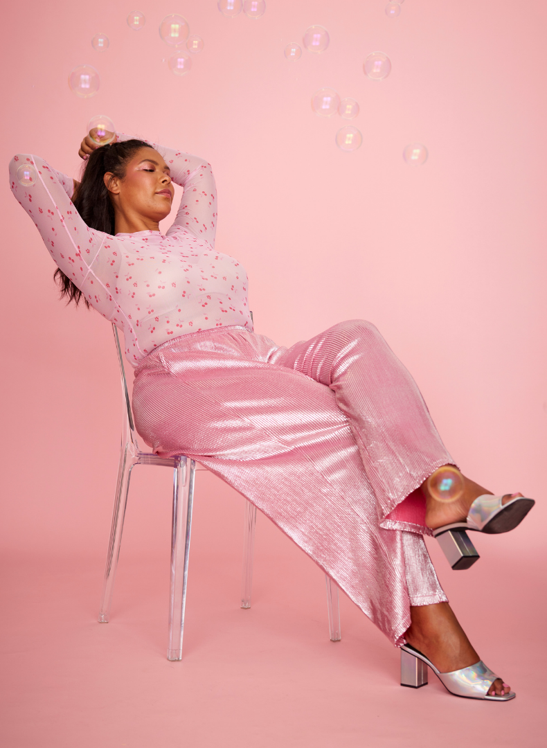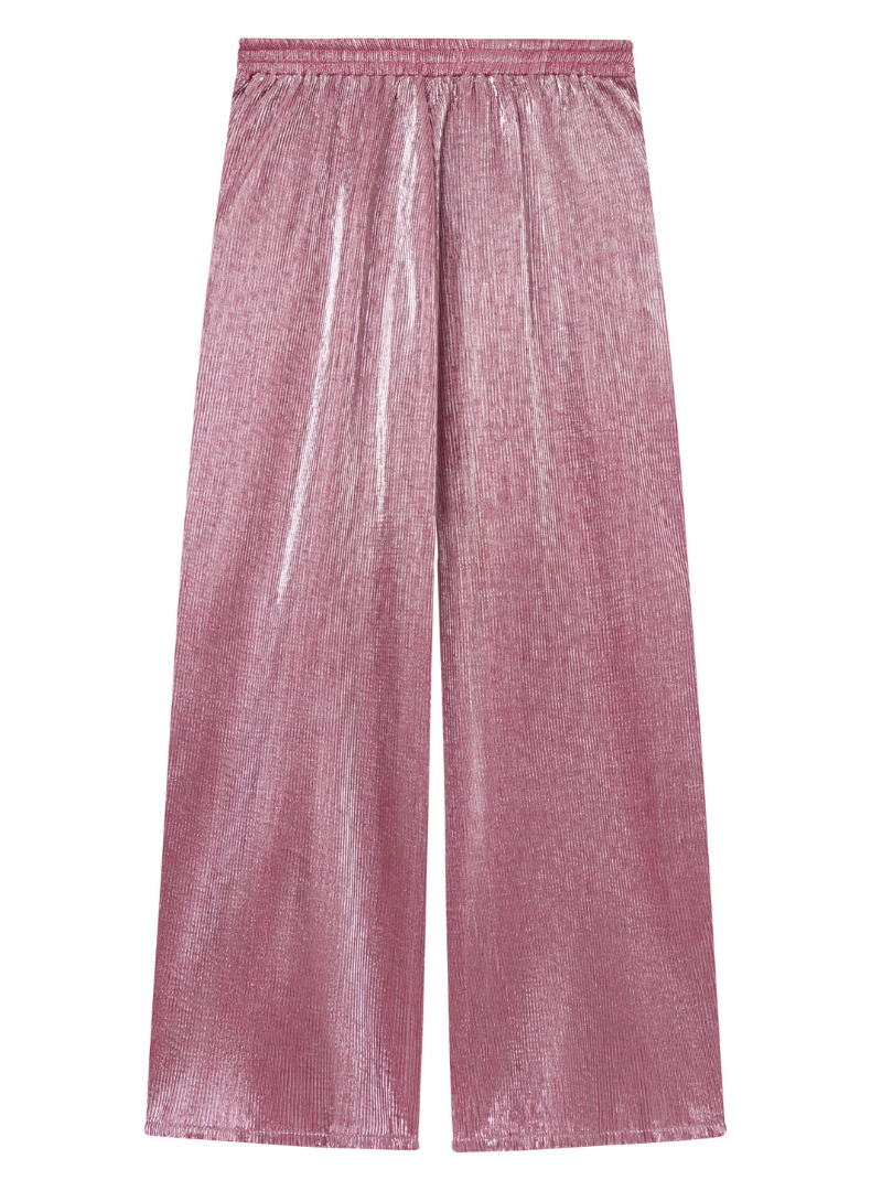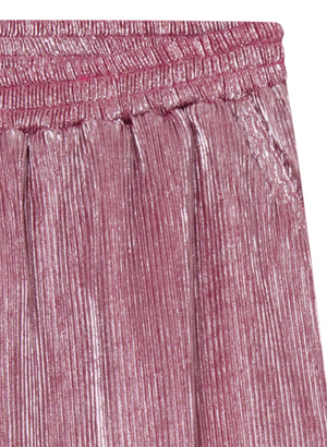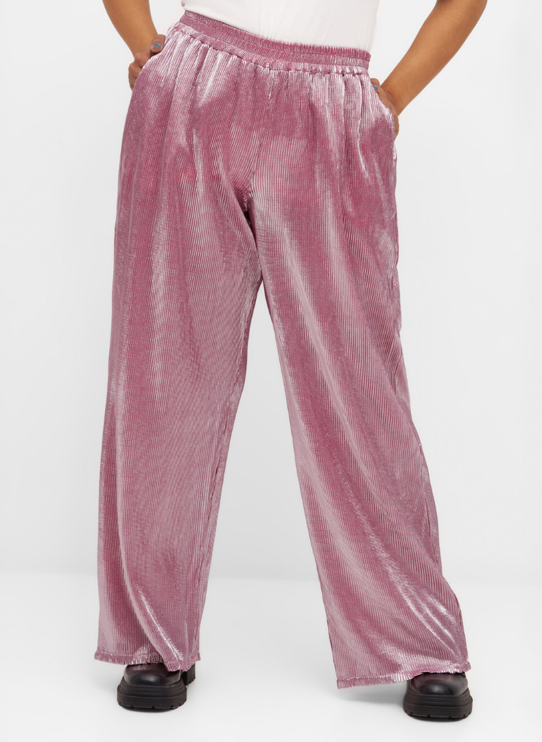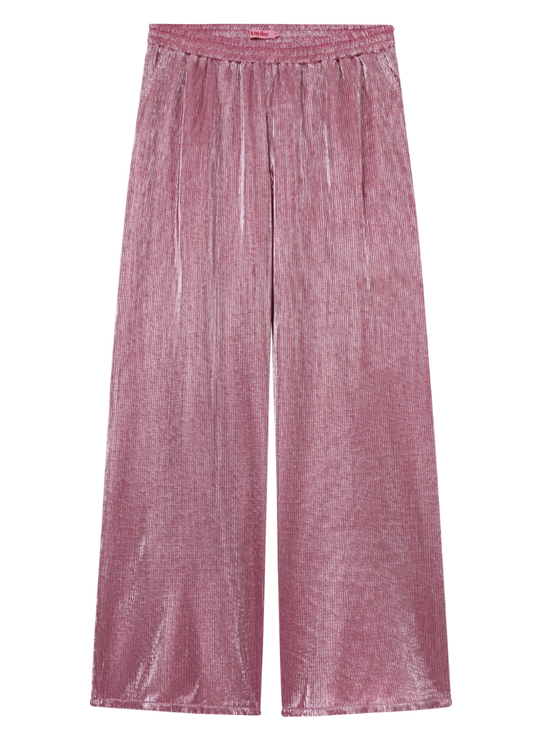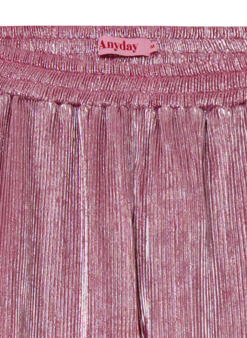 Buxurnar eru mjög frjálslegar og þægilegar, lausar víðar skálmar, góðir vasar og teygja í mittinu. Sniðið heitir 'Tuesday' hjá Anyday merkinu. 'Plisse' efni sem er fínlega plíserað með glansandi áferð.