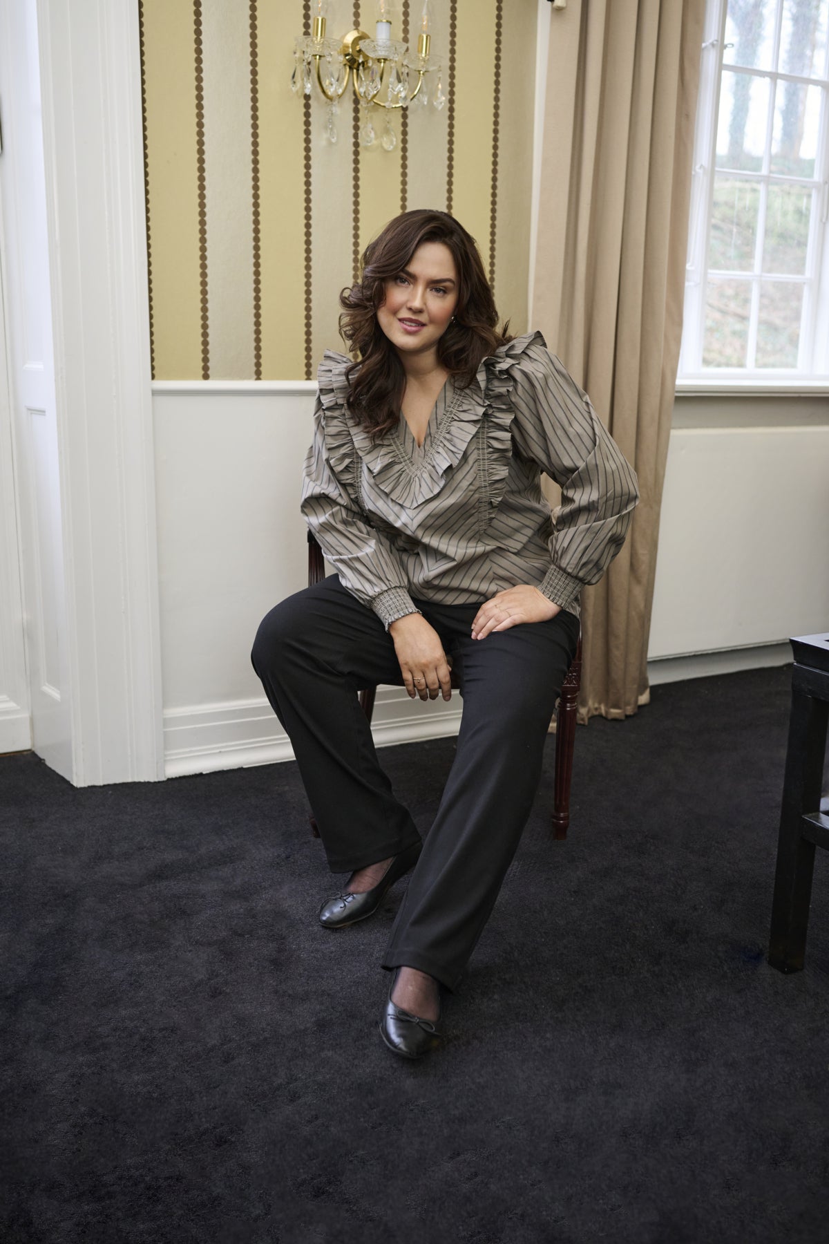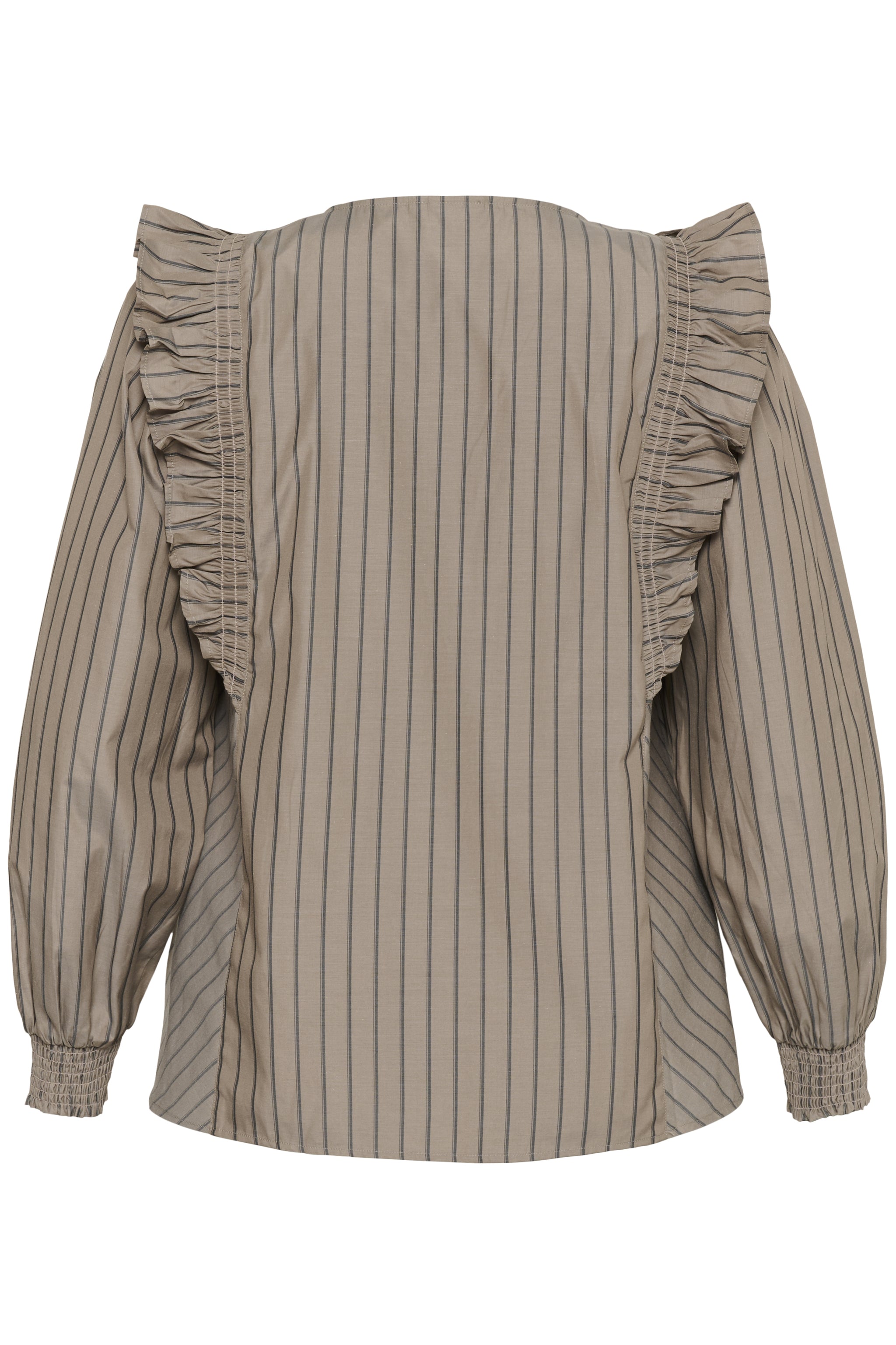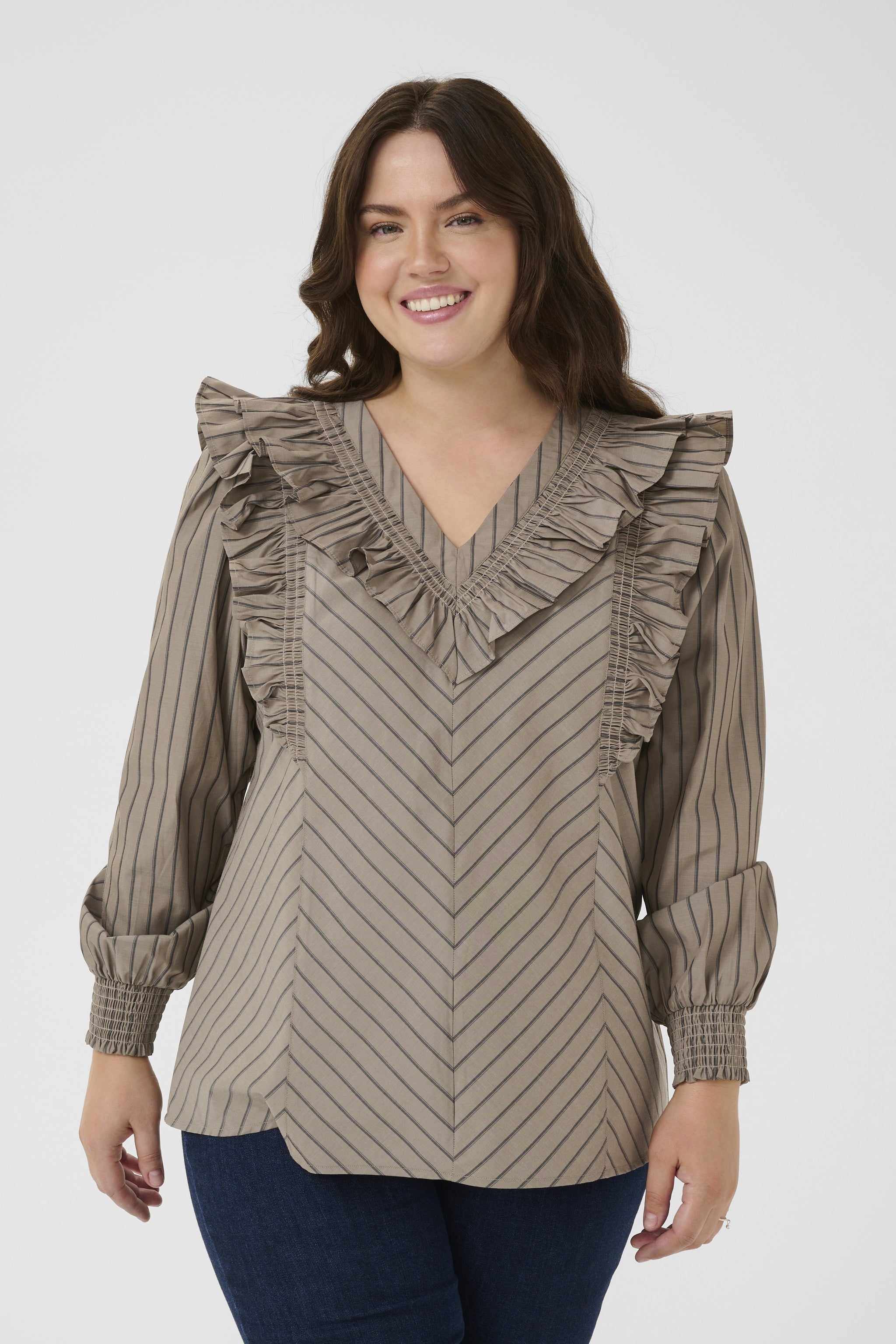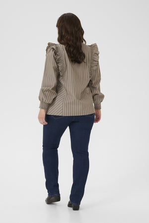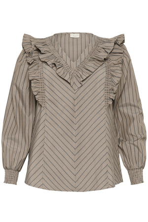 Blússan er fallega mocca brún með lóðréttum röndum.