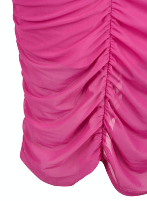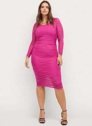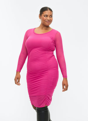 Kjóllinn er í bodycon sniði sem faðmar línurnar og er með klæðilegum rykkingum.