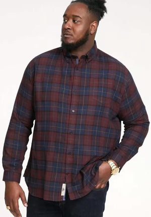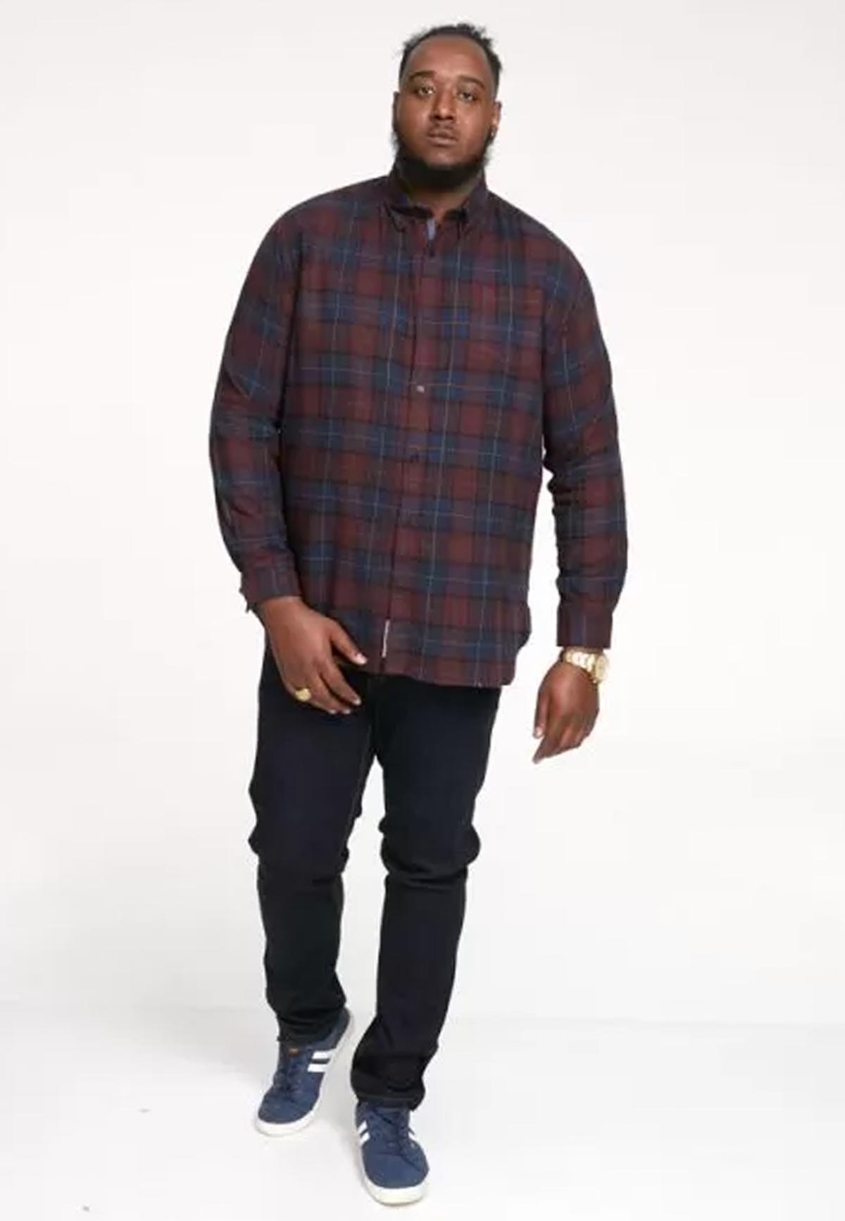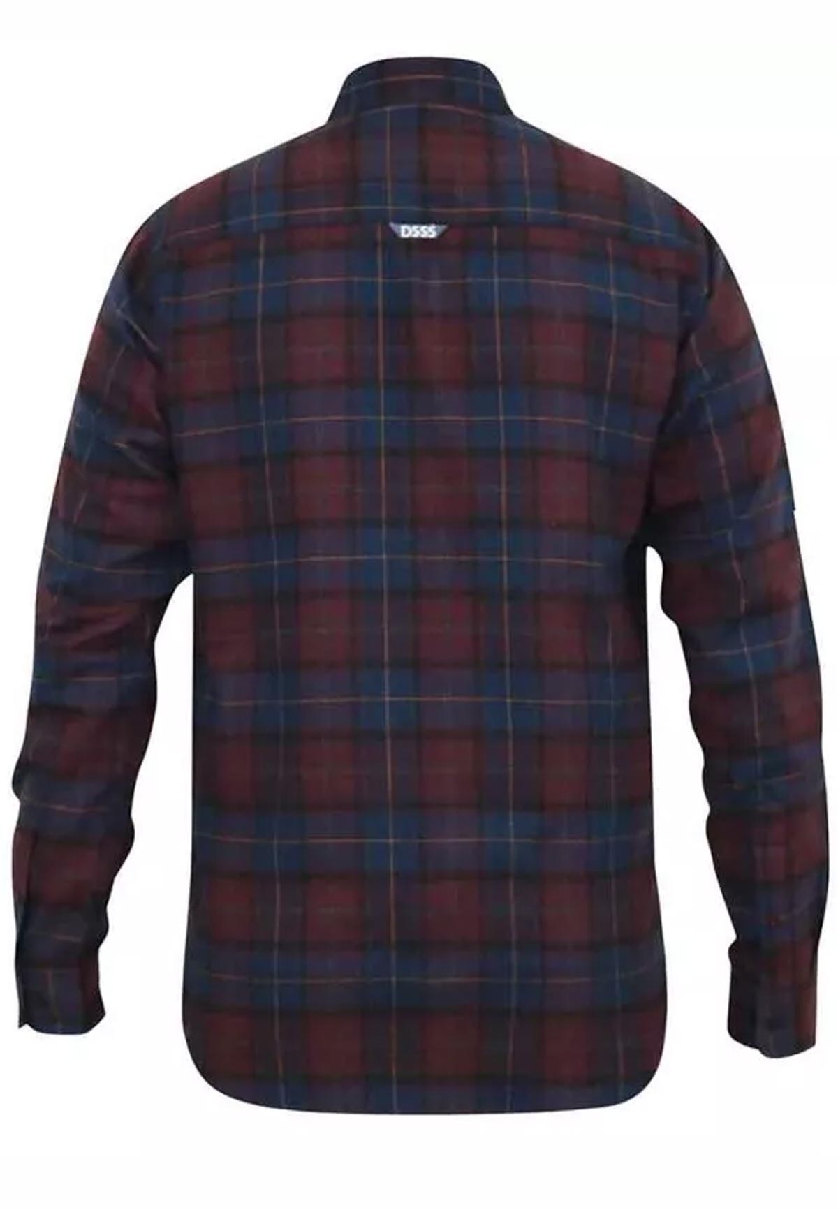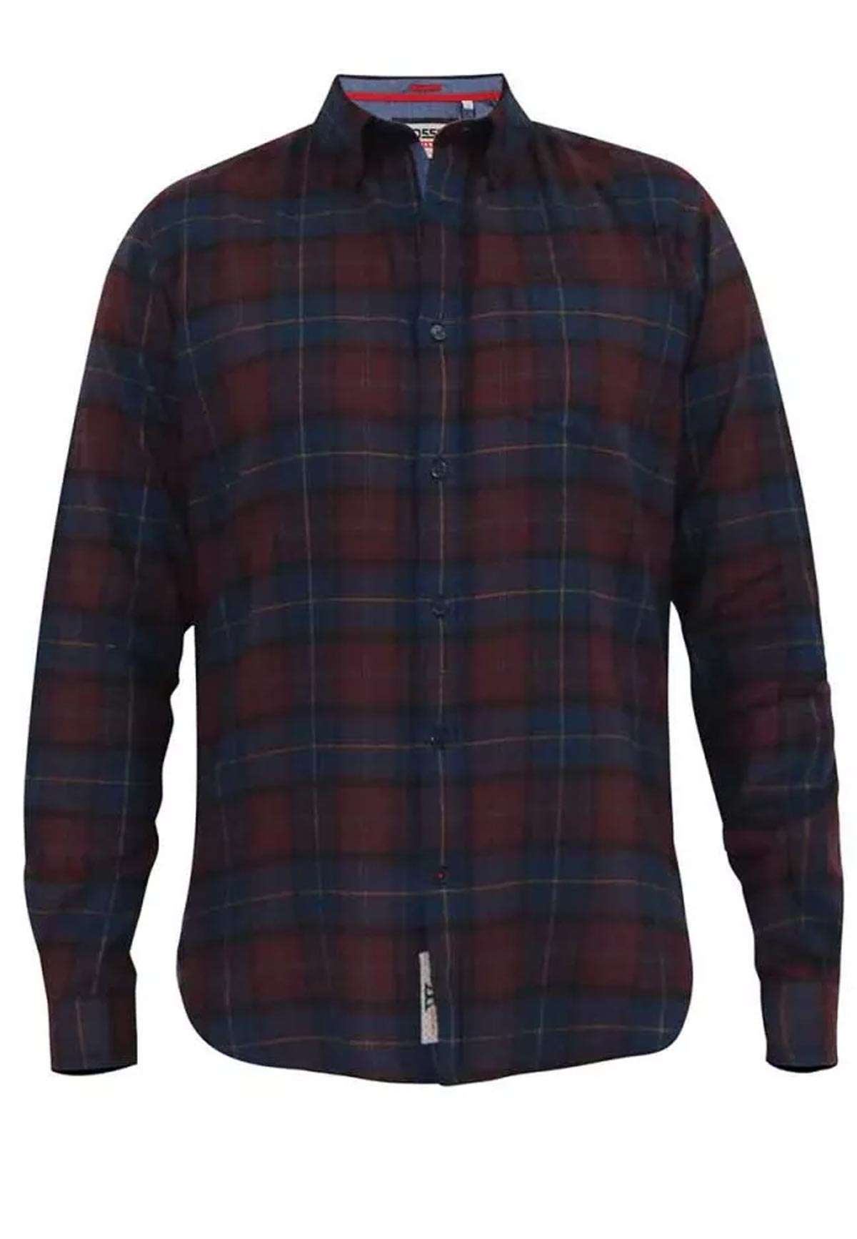 Skyrtan er dökkrauð í grunninn með dökku og gul köflóttu mynstri.