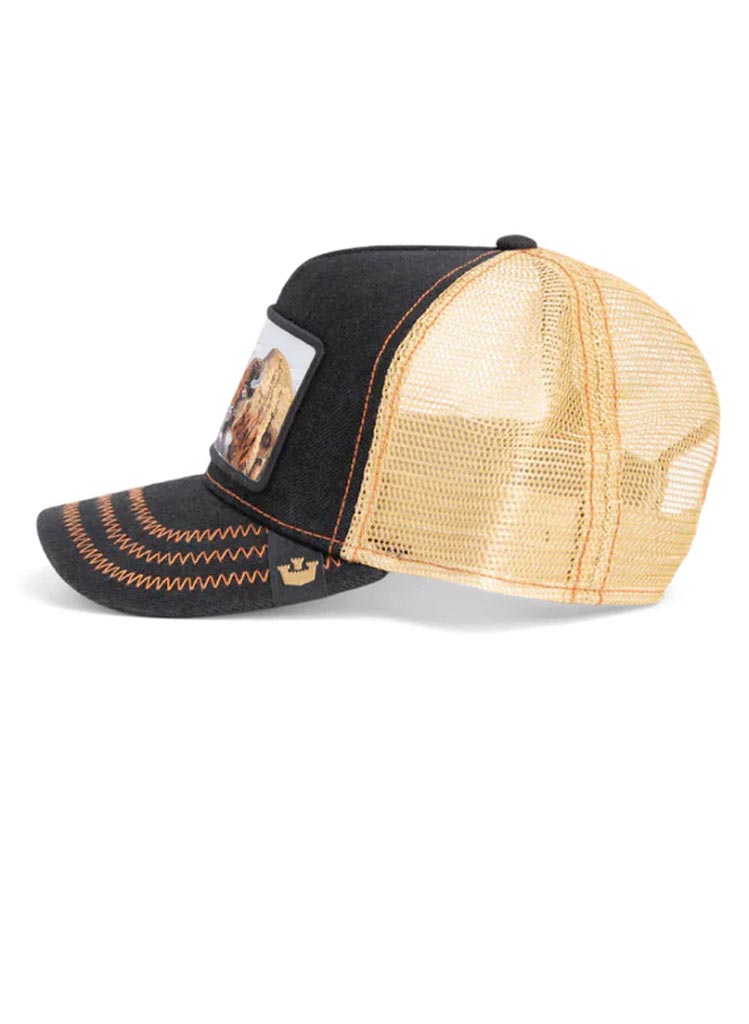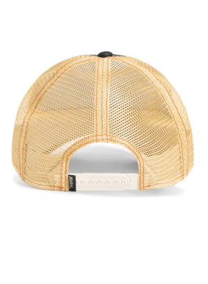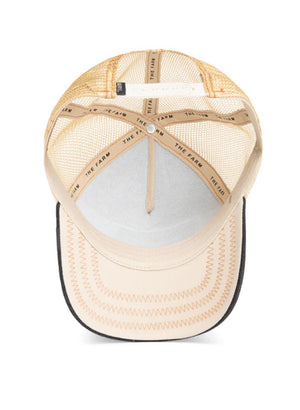 Þessi derhúfa er dökkblá í grunninn með ljósbrúnu neti að aftan.