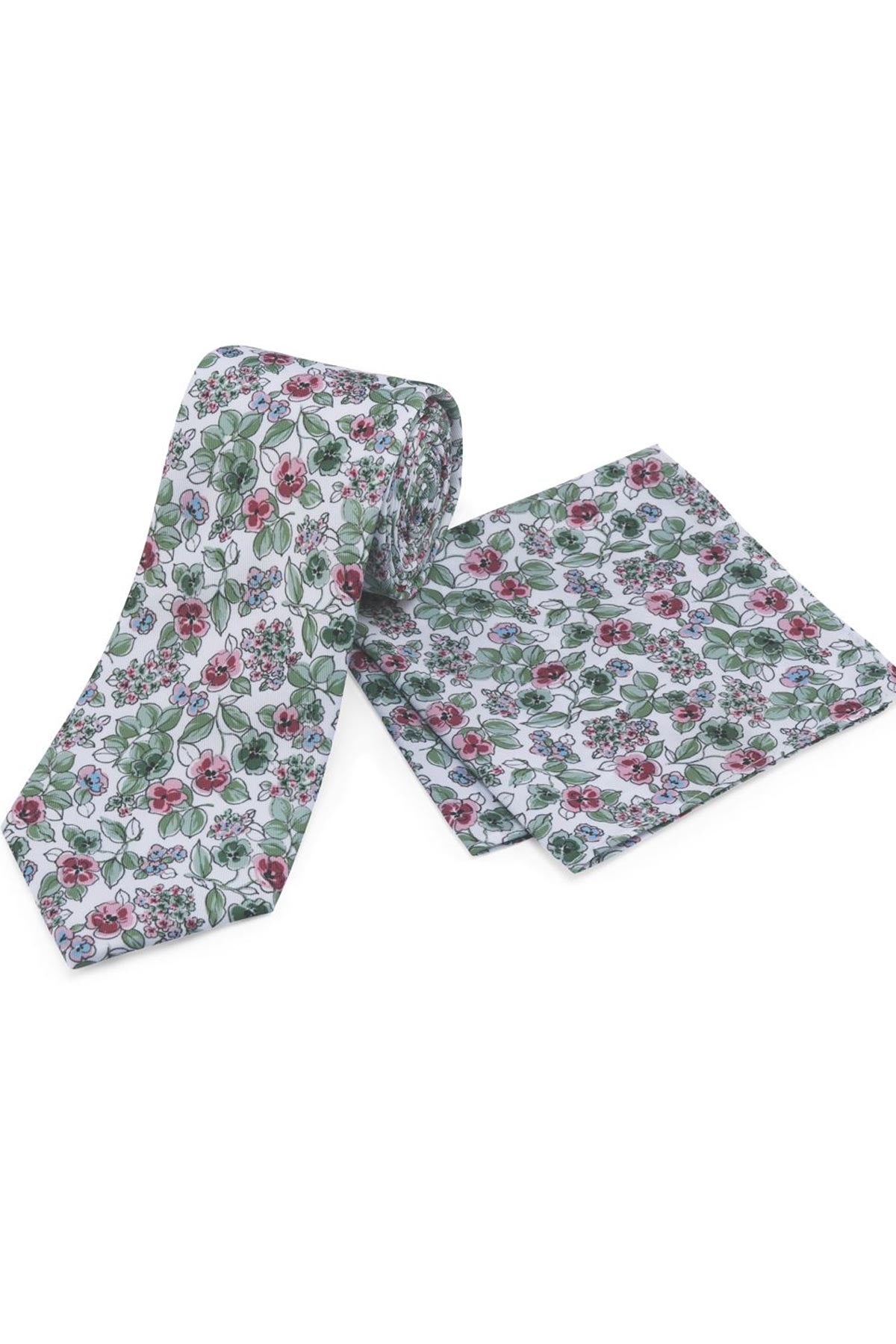 Sumarlegt ljóst og grænnt blóma mynstrað bindi og klútur frá lúxusmerkinu Skopes.