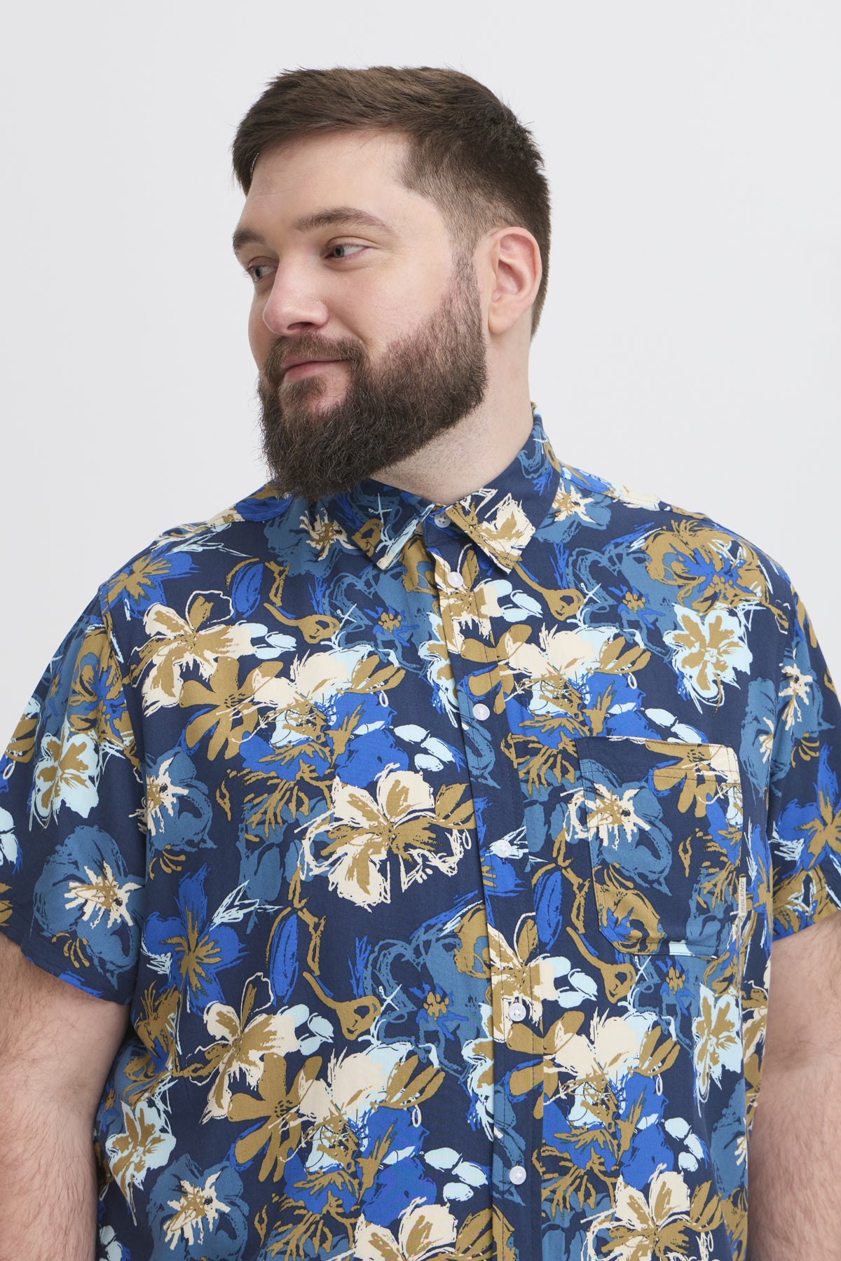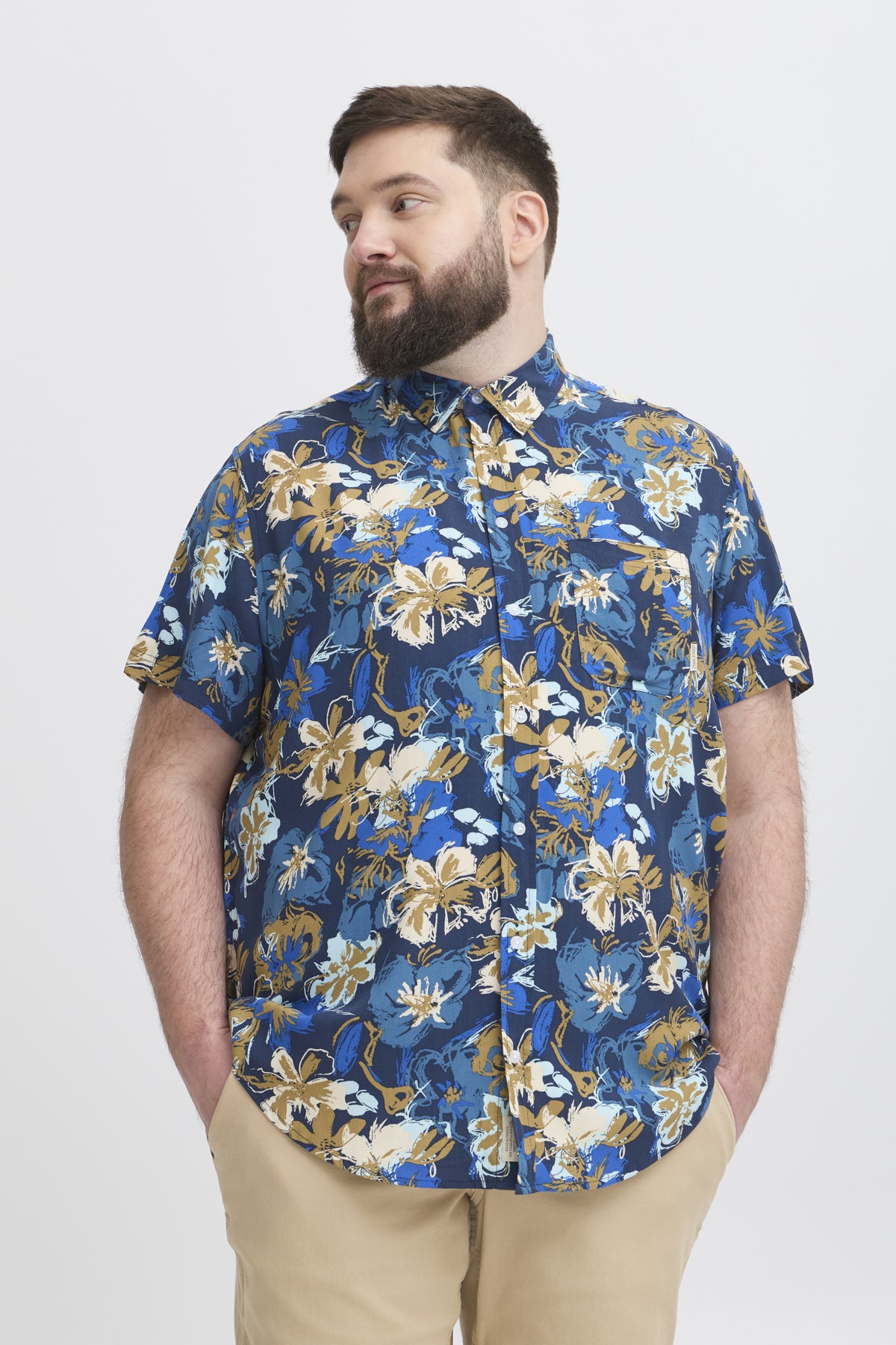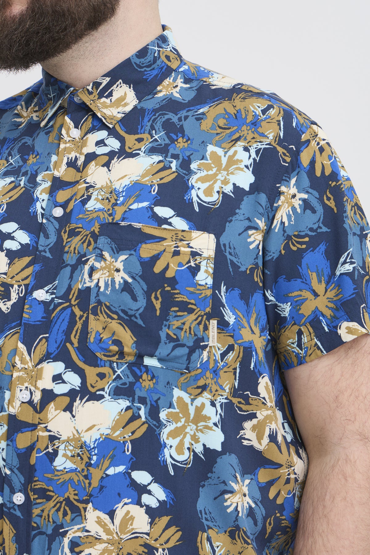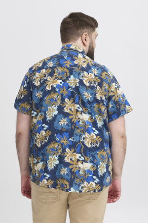 skyrtan er dökkblá á litin með ljósum abstrakt blómum.