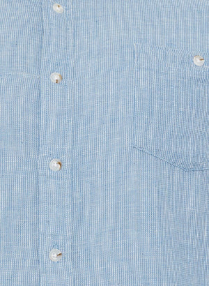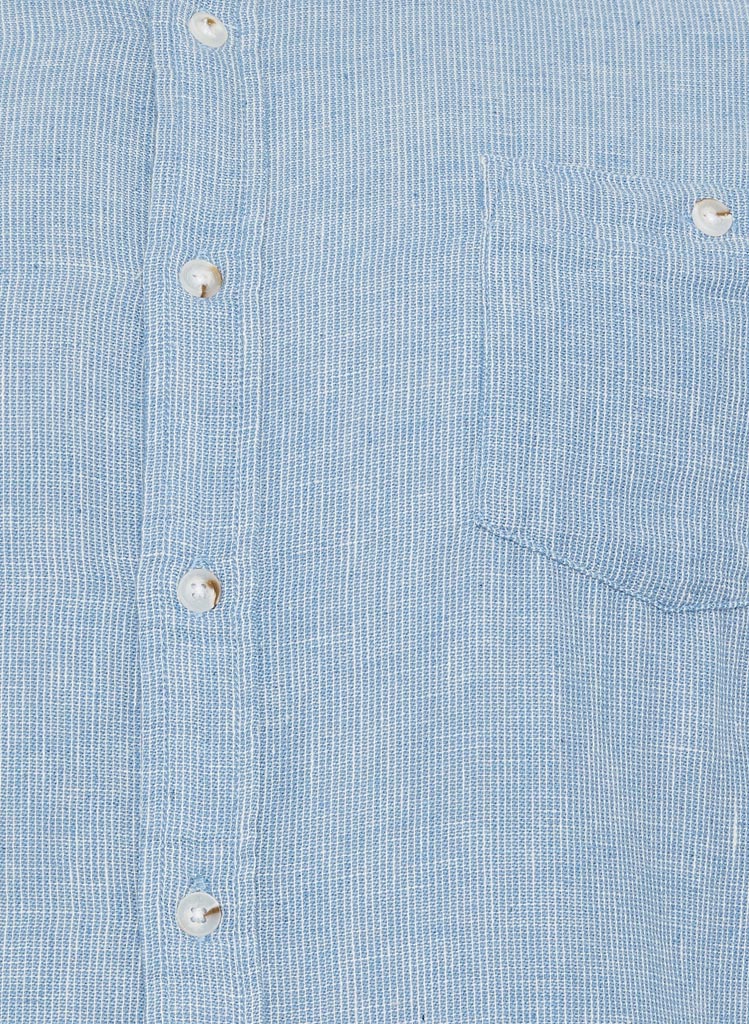 Skyrtan er ljósblá úr náttúrulegri blöndu af 75% bómul og 25% hör.