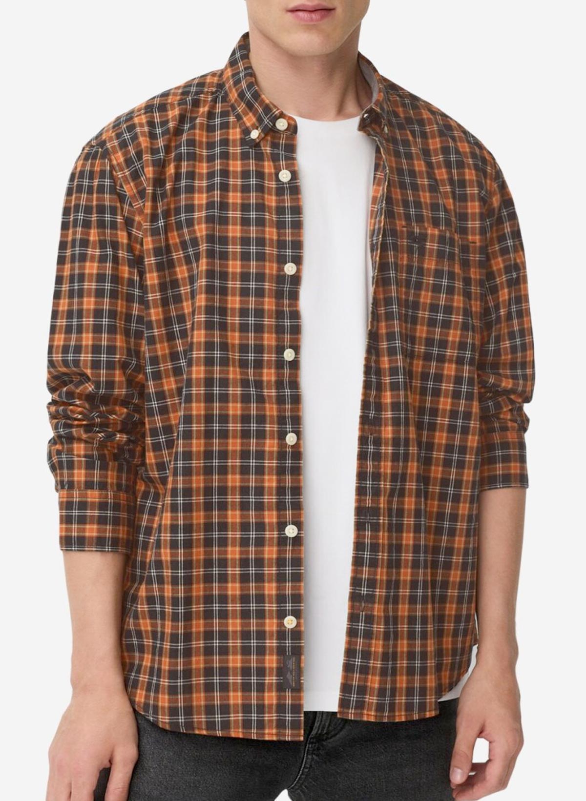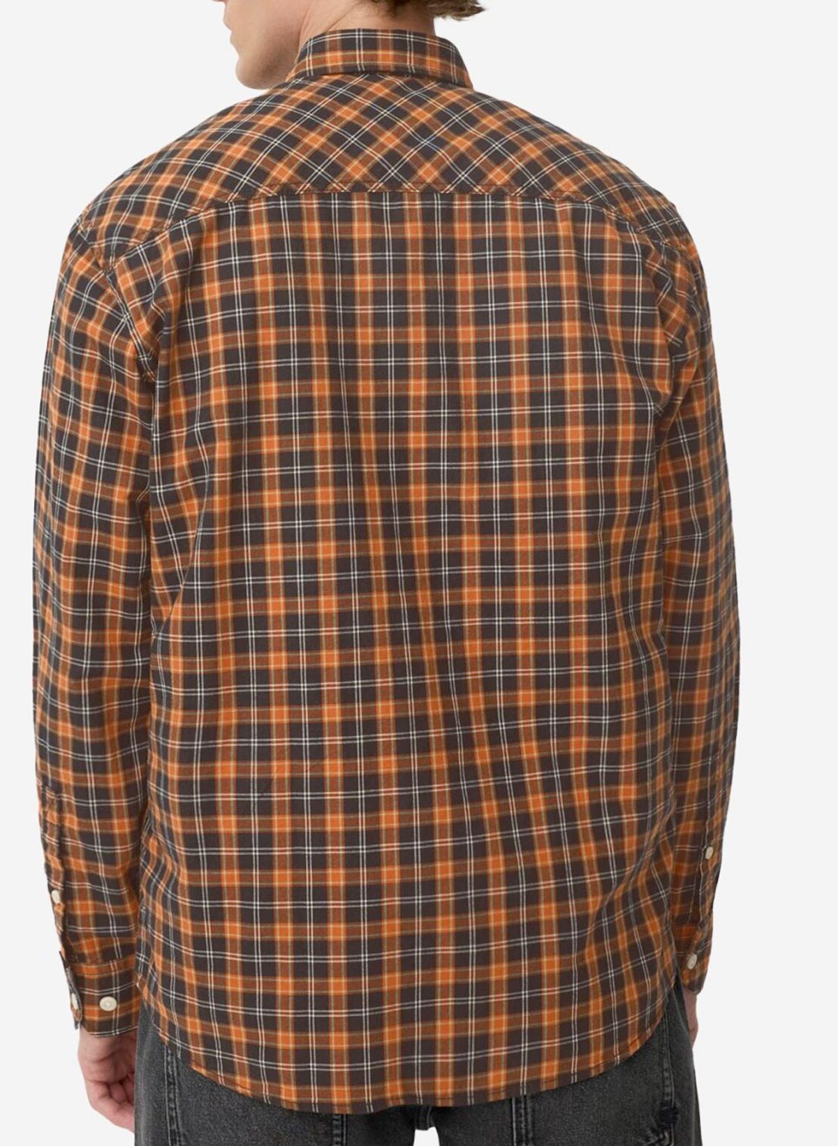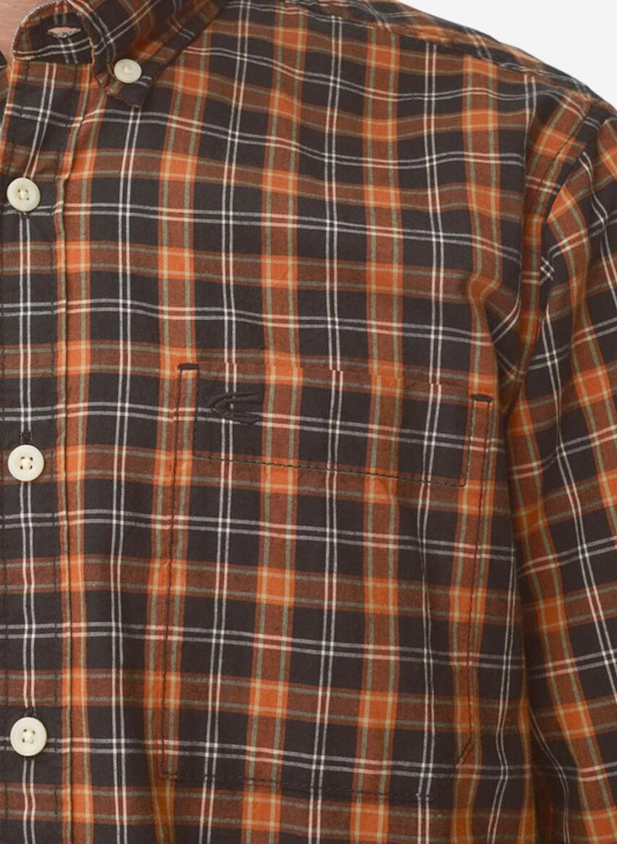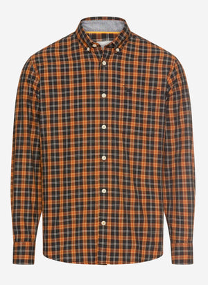 Hér höfum við vandaða bómullar skyrtu í grænum og appelsínugulum tónum.