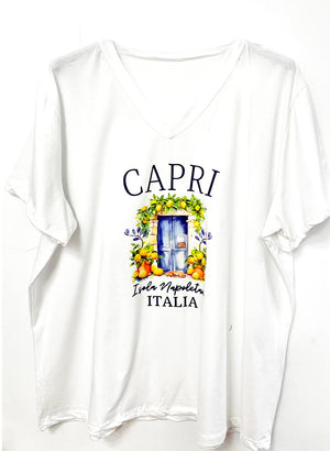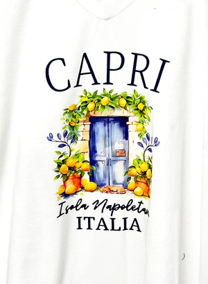Hvítur á litinn með áprentaðri grafík að framan og v-hálsmáli.