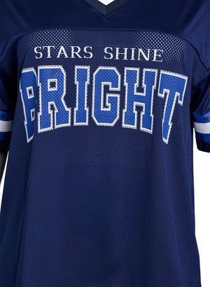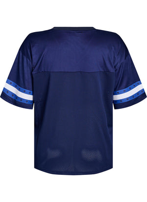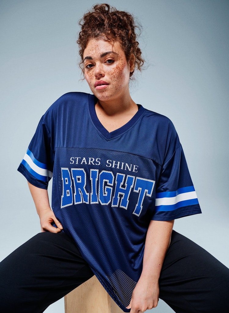 Bolurinn er víður í sniðinu með V-hálsmál lausar hálfar ermar og skemmtilegu háskóla bola útliti.