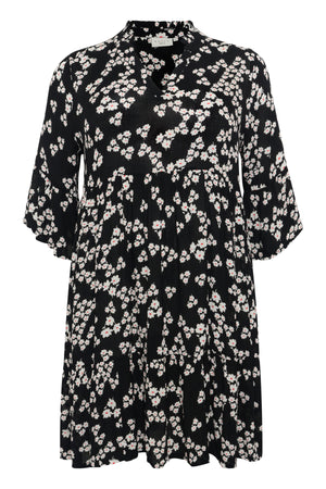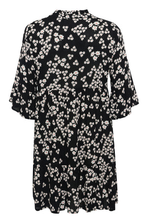 Kjóllinn er svartur í grunninn með smáu hvítu/rauðu blómamynstri.