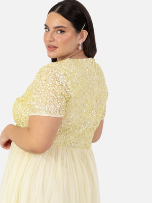 Kjóllinn er þakin perlum og pallíettum að ofan og út frá mittinu er tveggjalaga tjullpils.