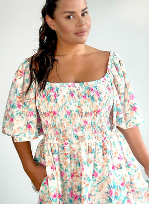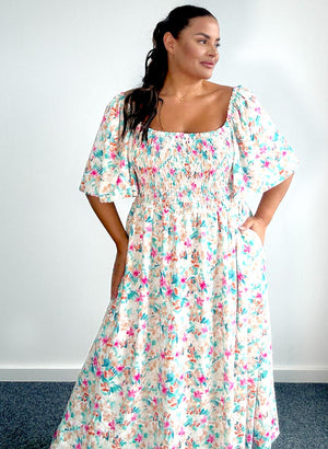 Sumarlegur síður blómakjóll úr léttu náttúrulegu efni.
