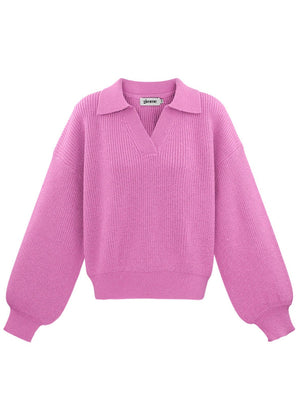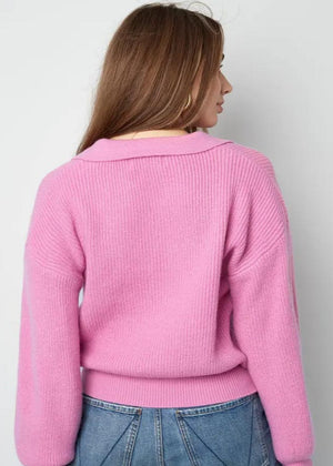 Falleg bleik peysa með kraga og v-hálsmáli.
