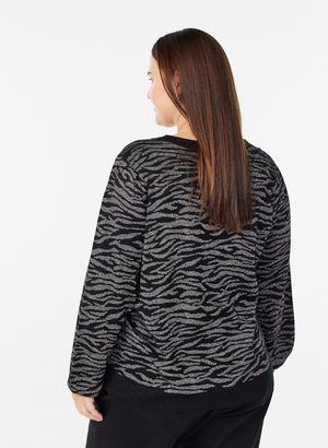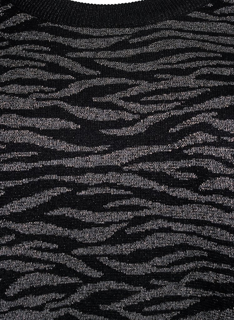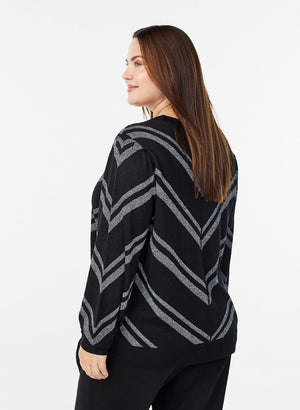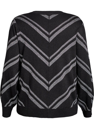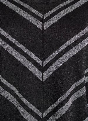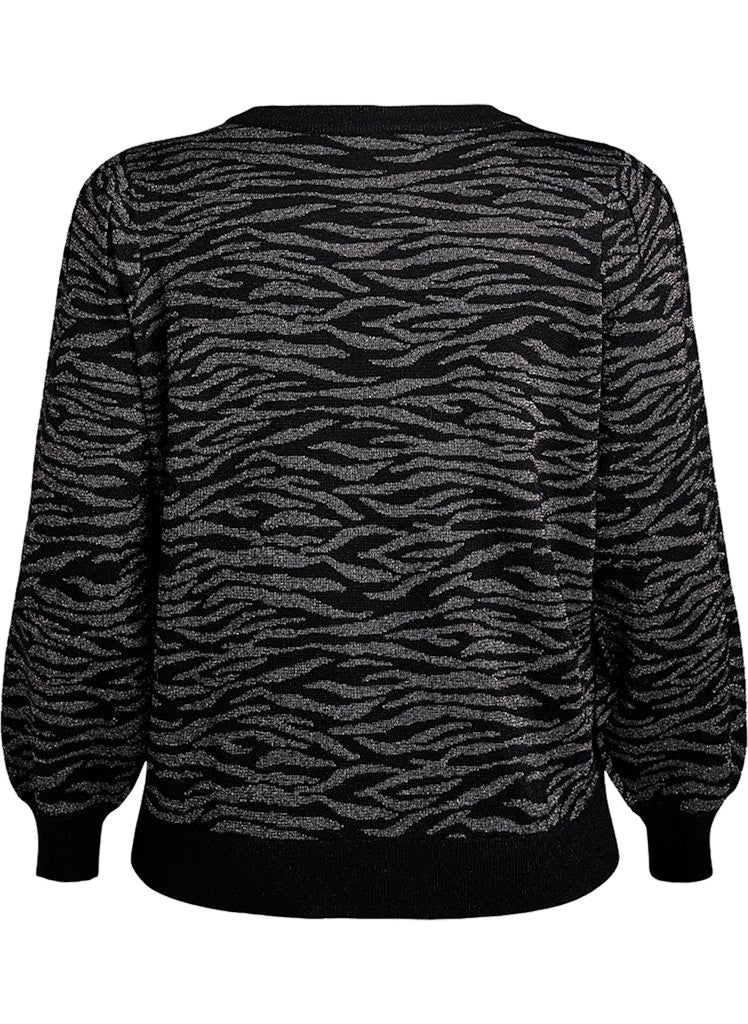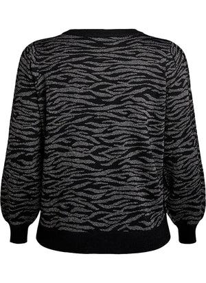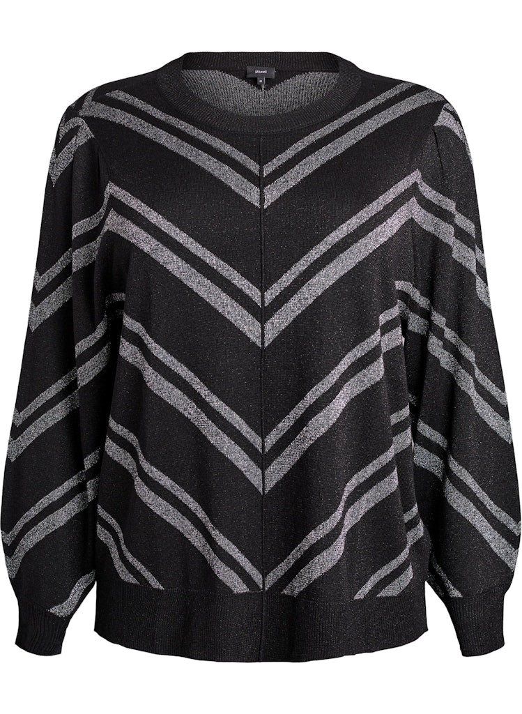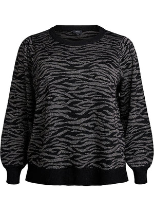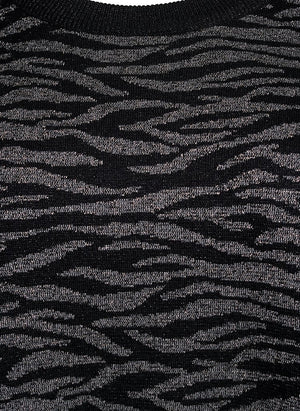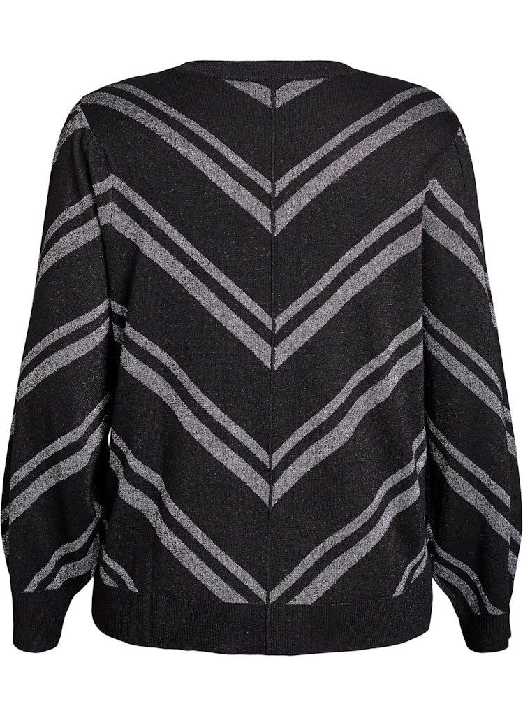 Peysan er í svört lit, fallega mynstruð og með litlum glitrandi silfurlurex þráðum.