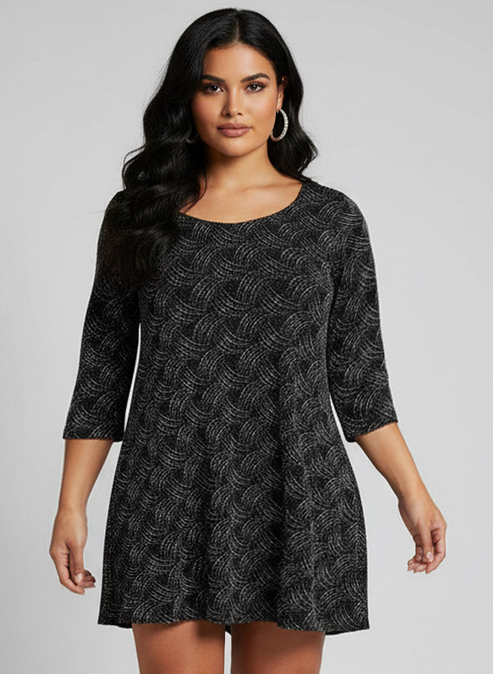 Þessi klæðilega A-sniðs túnika eða stutti kjóll er úr teyganlegu efni með smáum glitrandi þráðum sem gerir hana extra sparilega fyrir desember!