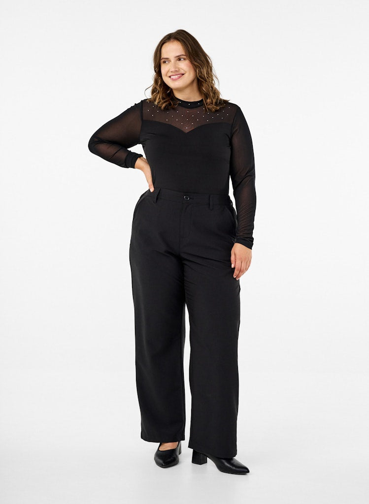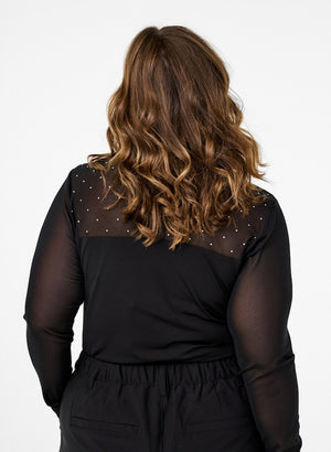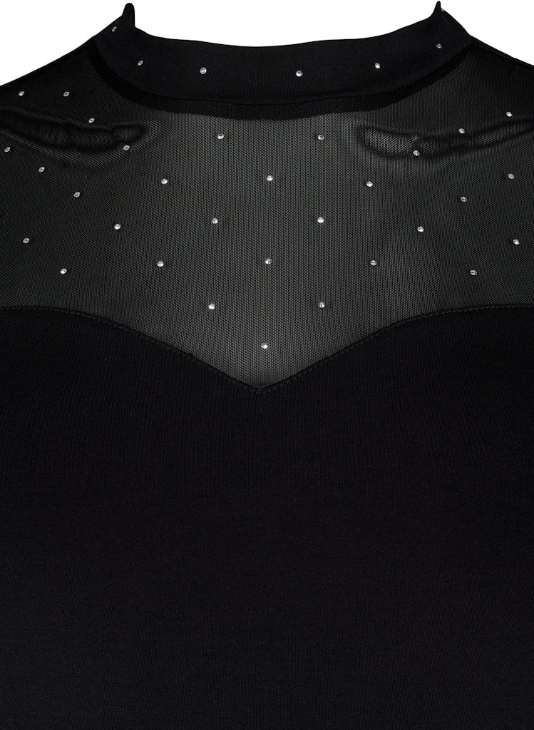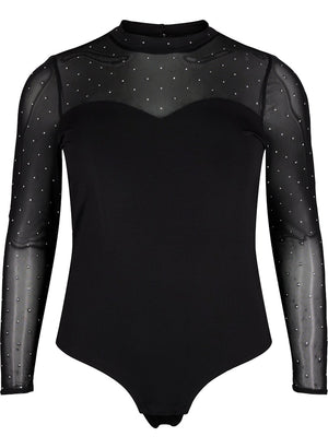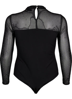Fínlegt og vandað mesh efni í ermum og framan á bringu en restin af samfellunni er úr teygjanlegu svörtu efni.