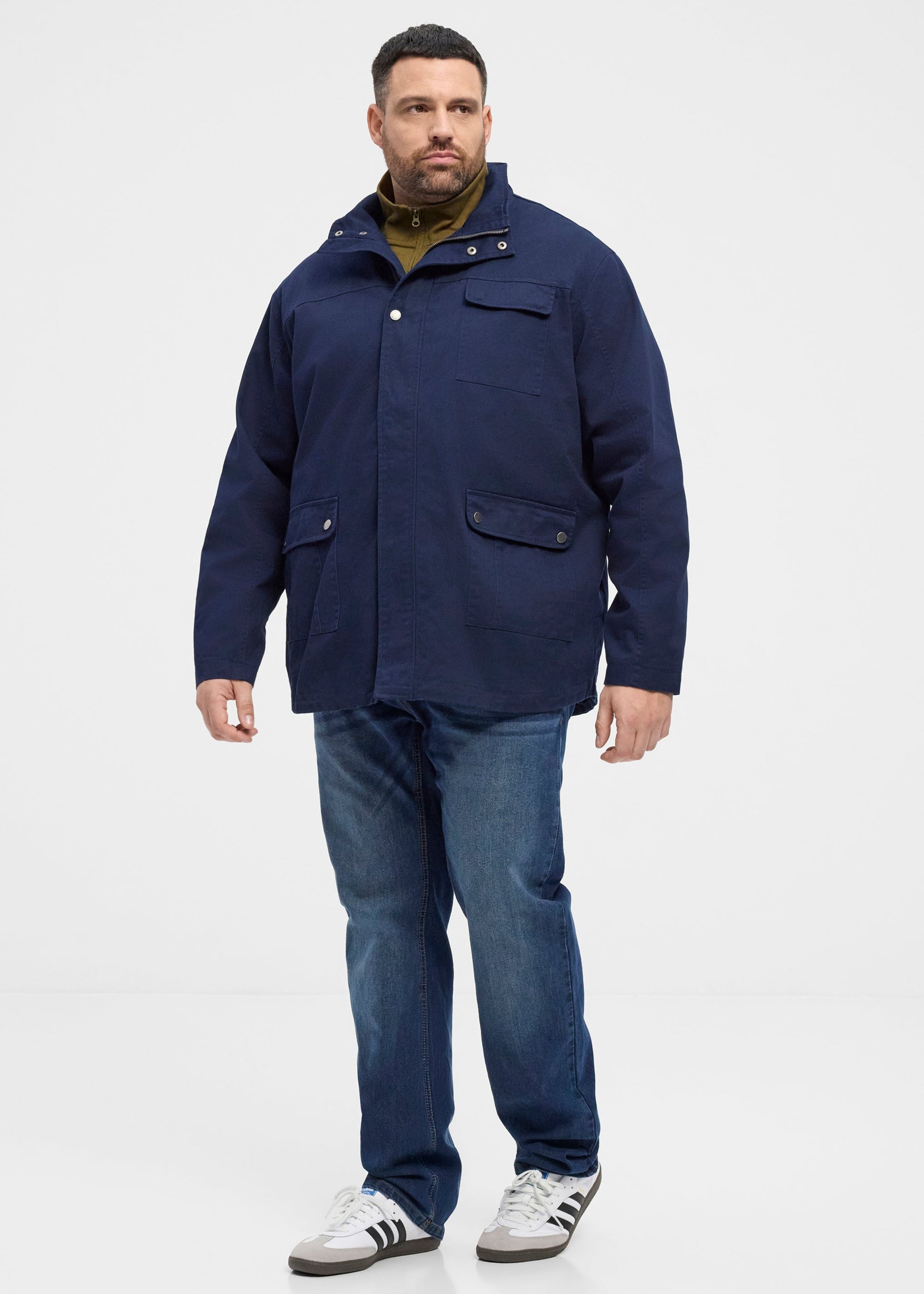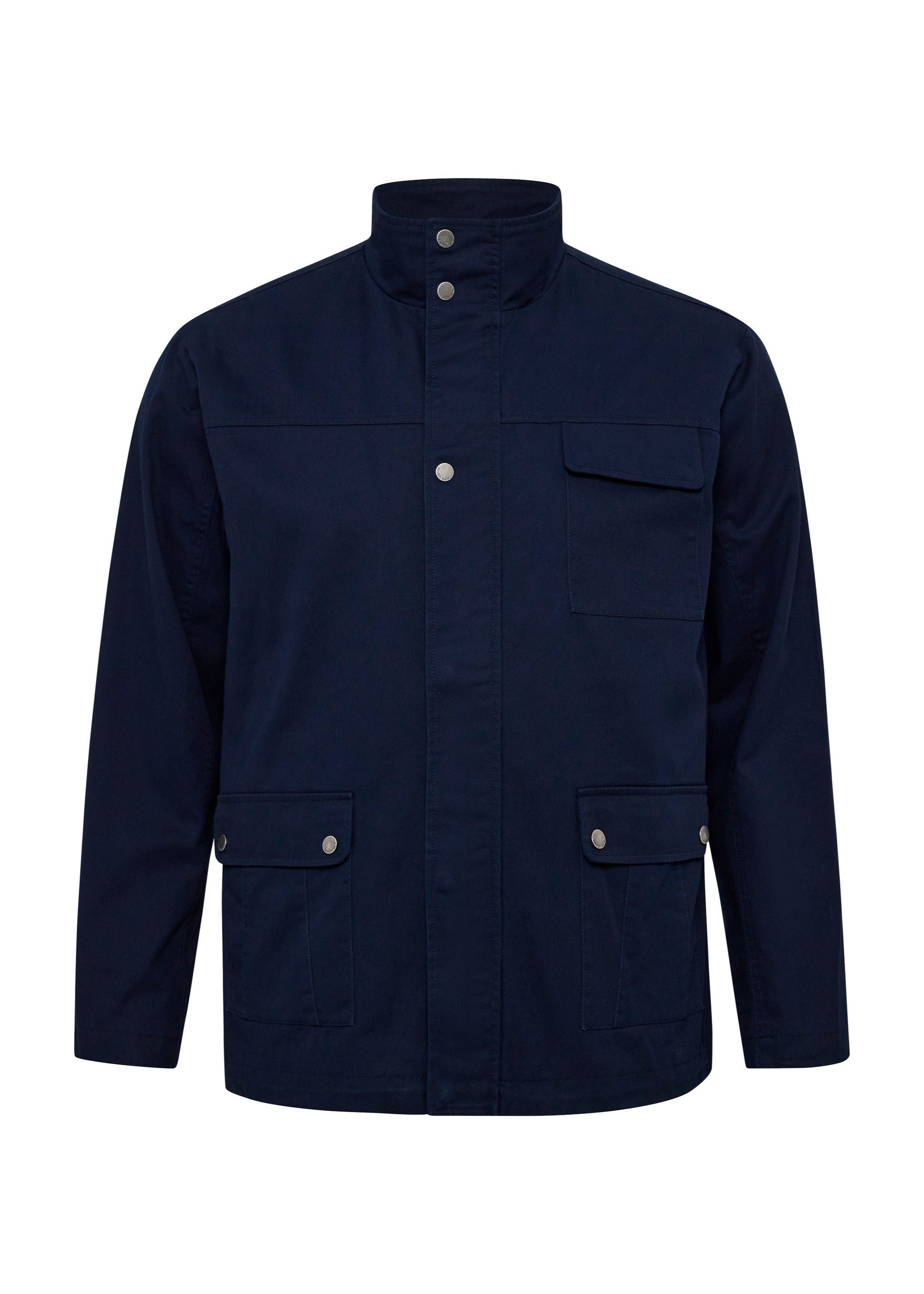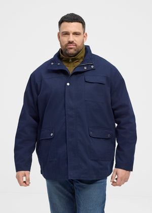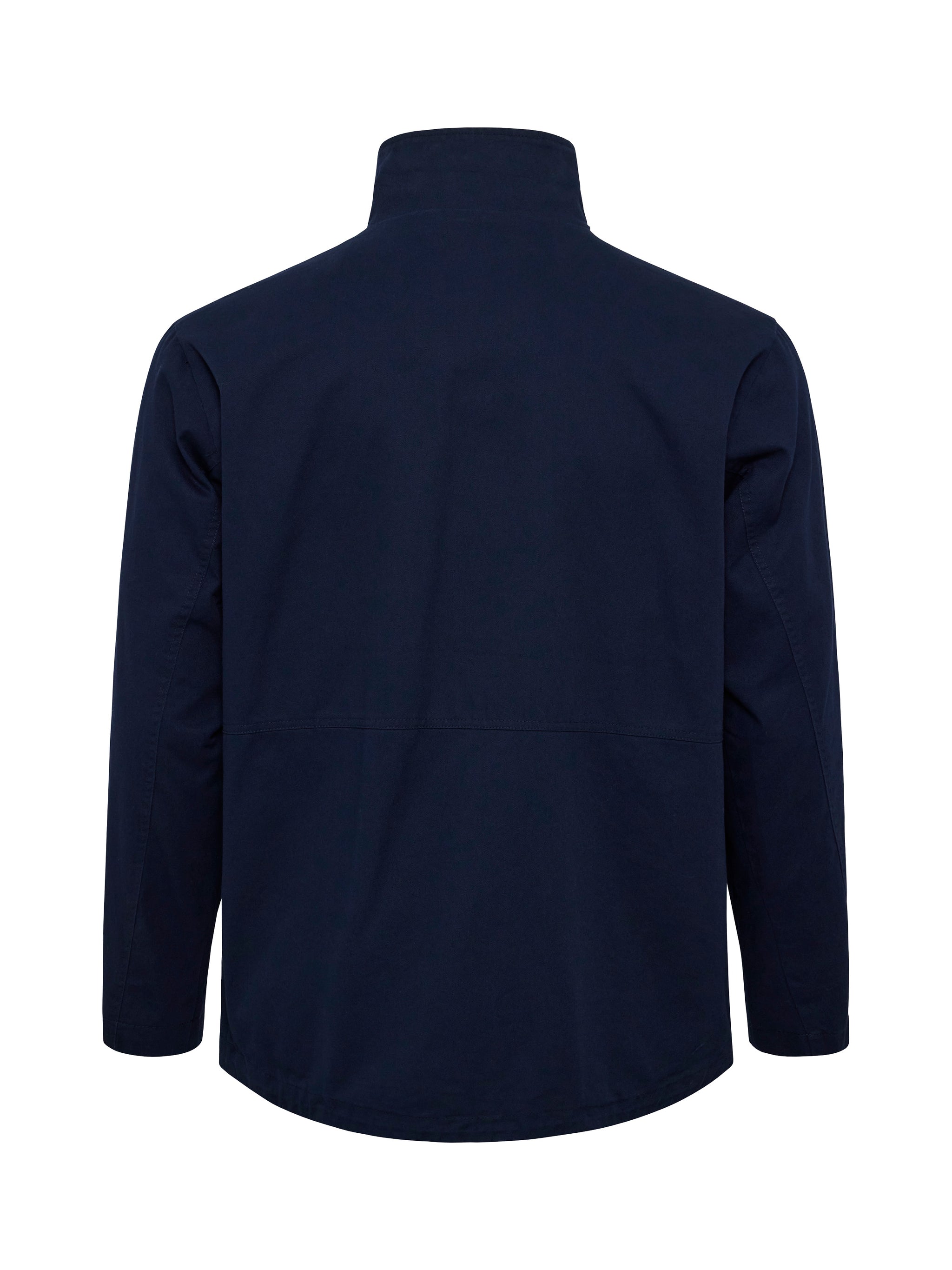 Efnið í jakkanum er einlitt dökkblátt úr 100% bómul og létt polyester fóður að innan.