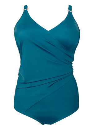 Klæðilegt wrap snið með rykkingum og aðhaldi yfir magasvæðið.